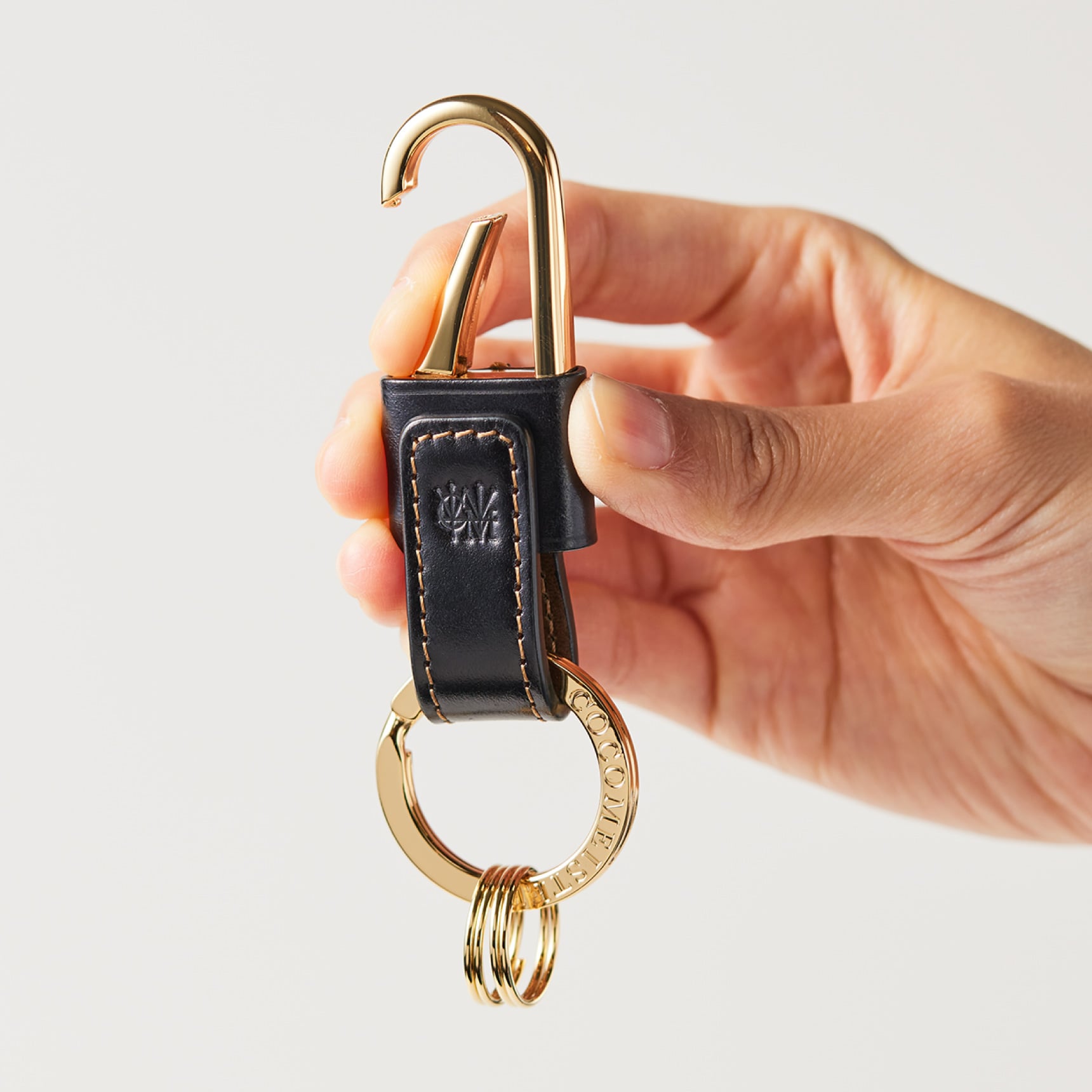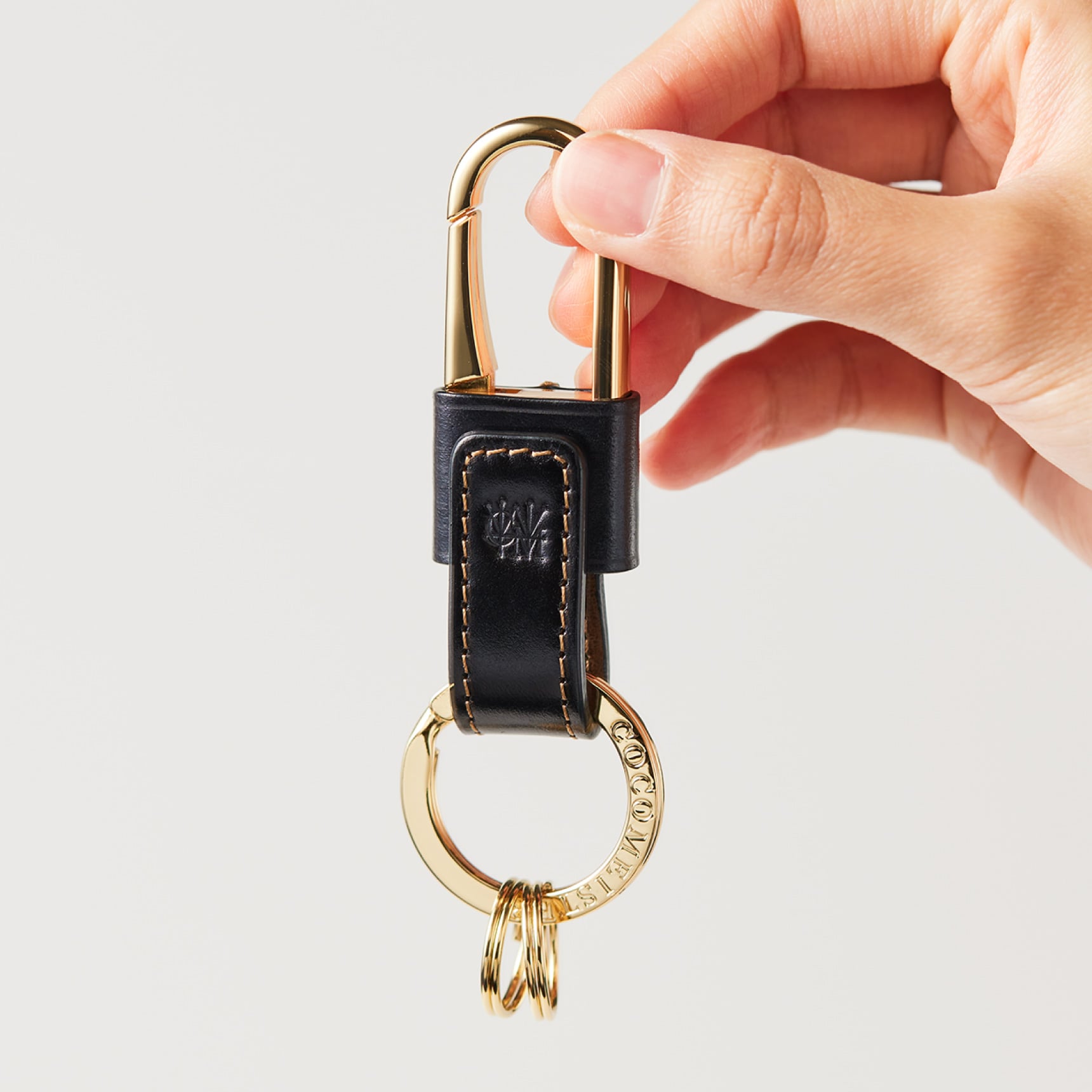 日本製の最高級コードバンと金具のコントラストがお洒落なキーリングです。全体を短めにデザインしていますので、可愛さと格好良さが調和しており、とてもお洒落なデザインに仕上がっています。鍵をつけて、バッグの中で取り付けたり、家の中でもどこかに引っ掛けて置いたり、多種多様な使い方をする事ができます。