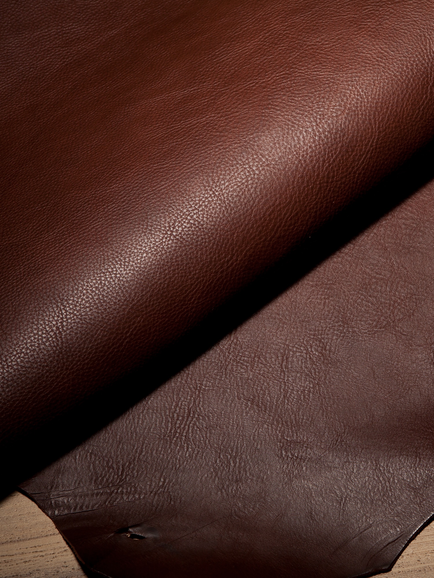 目立つシミや、生前傷は革の裁断時に避けて使用します。革らしい風合いを楽しめるレザーです。牛のシワや、血筋なども見ることができます。表面加工を極力抑えた、魅力的な革素材です。