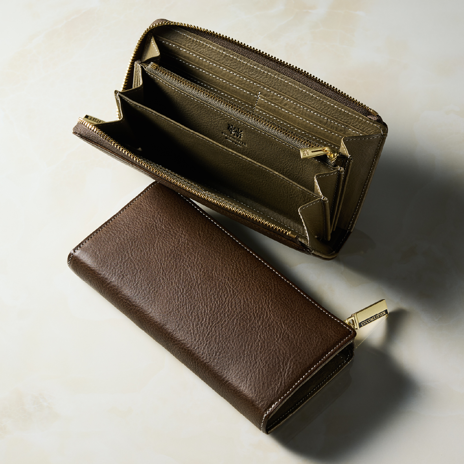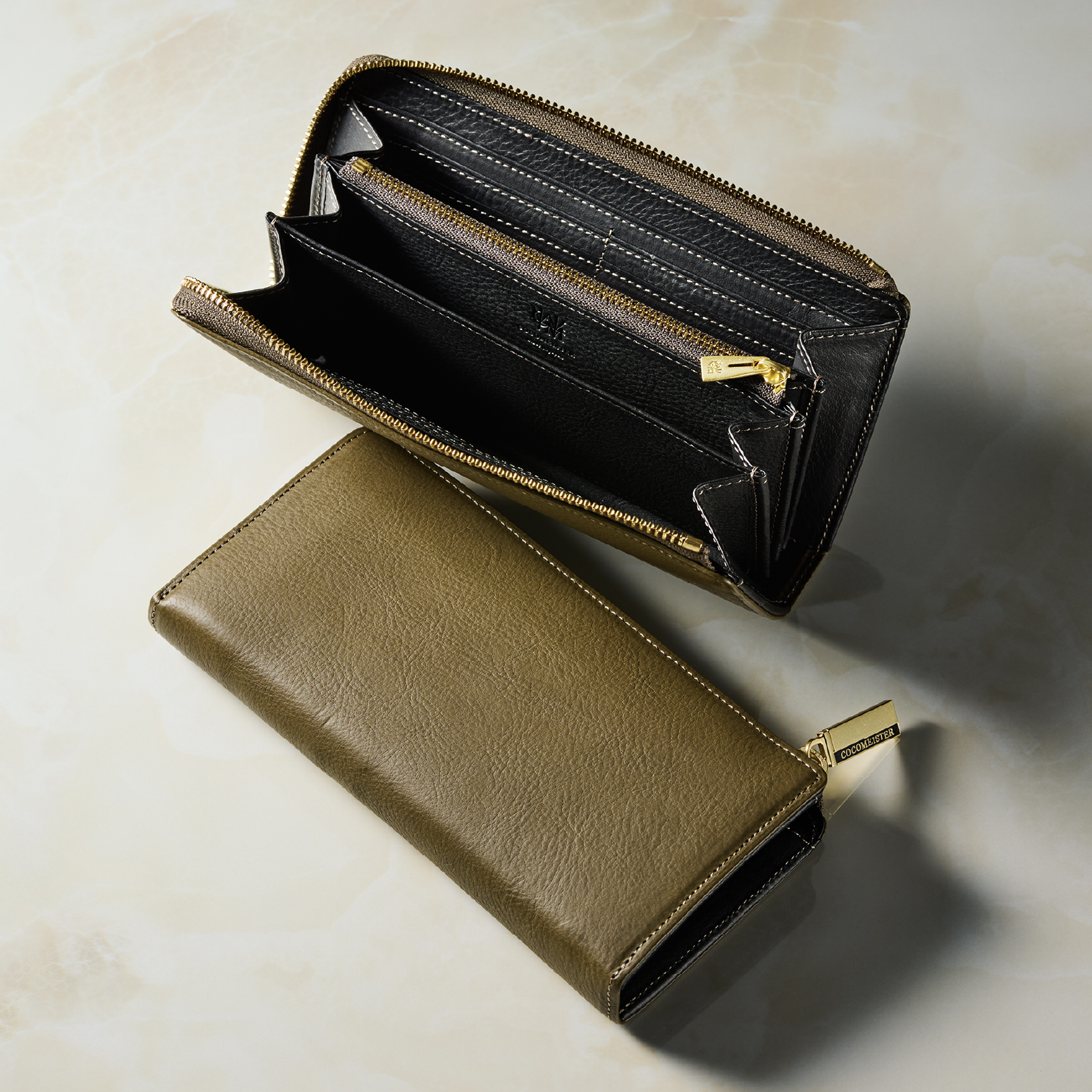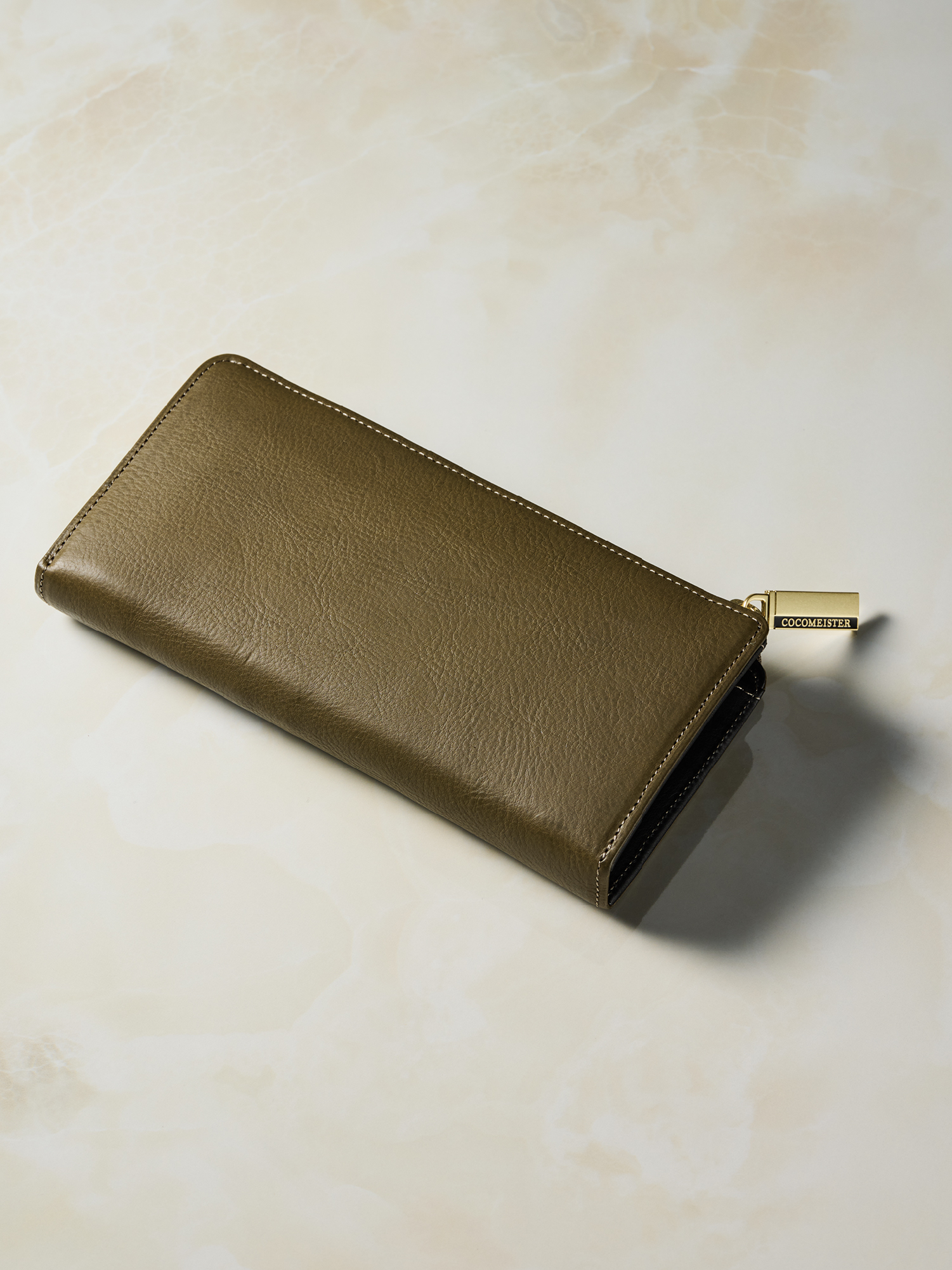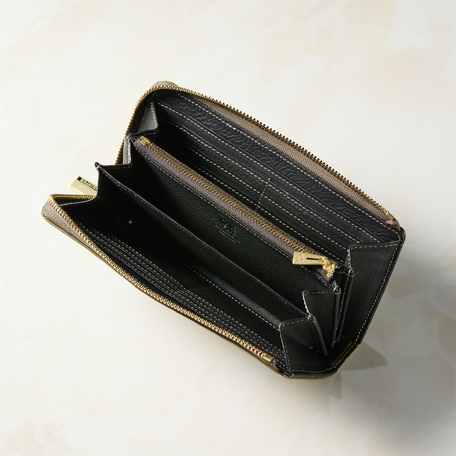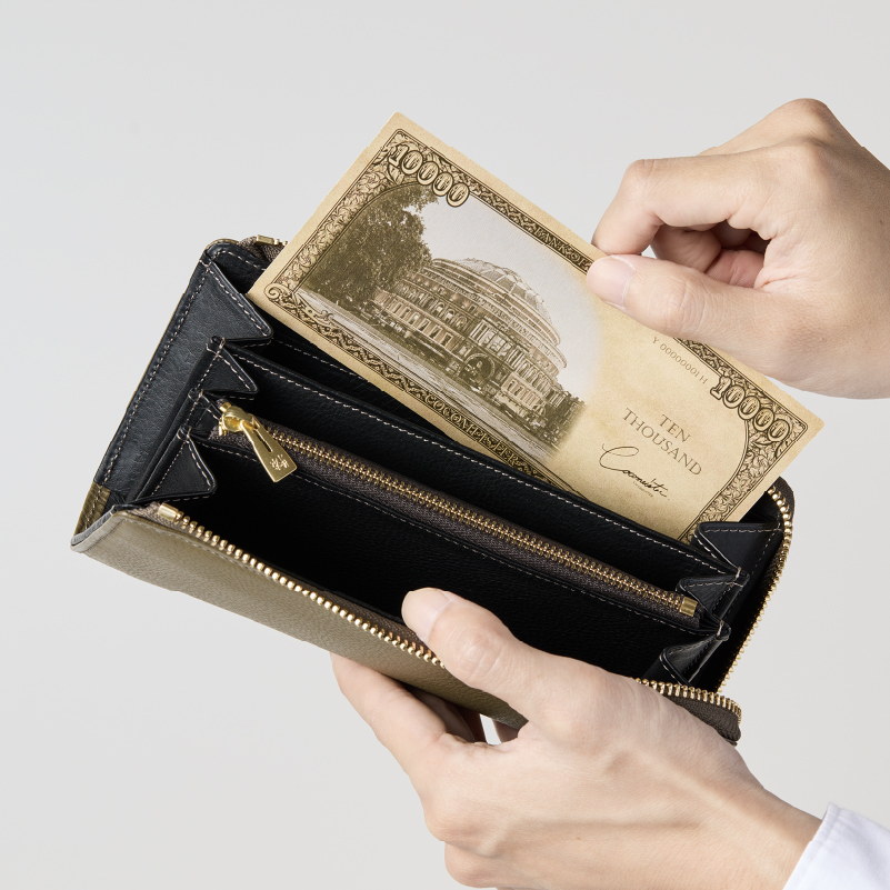 L字ファスナーは軽く開き、蛇腹マチが大きく広がるため中身を一望できます。中央に小銭入れ、左右にカード段12、フリーポケットも複数備え、紙類の整理まで自然にできる構造。紙幣は折らずに収納可能で、動線が整った“気持ちの良い使い心地”が魅力です。