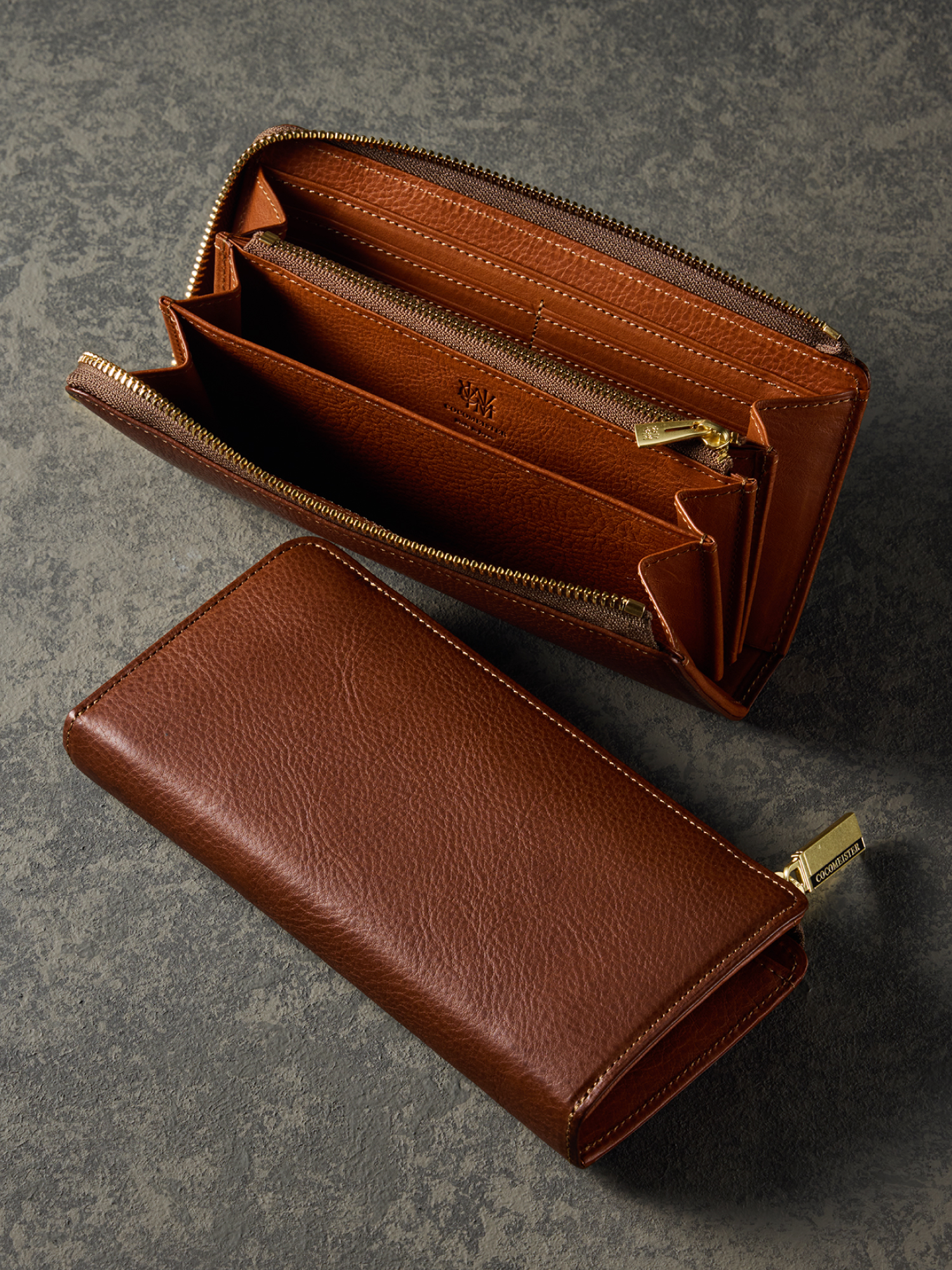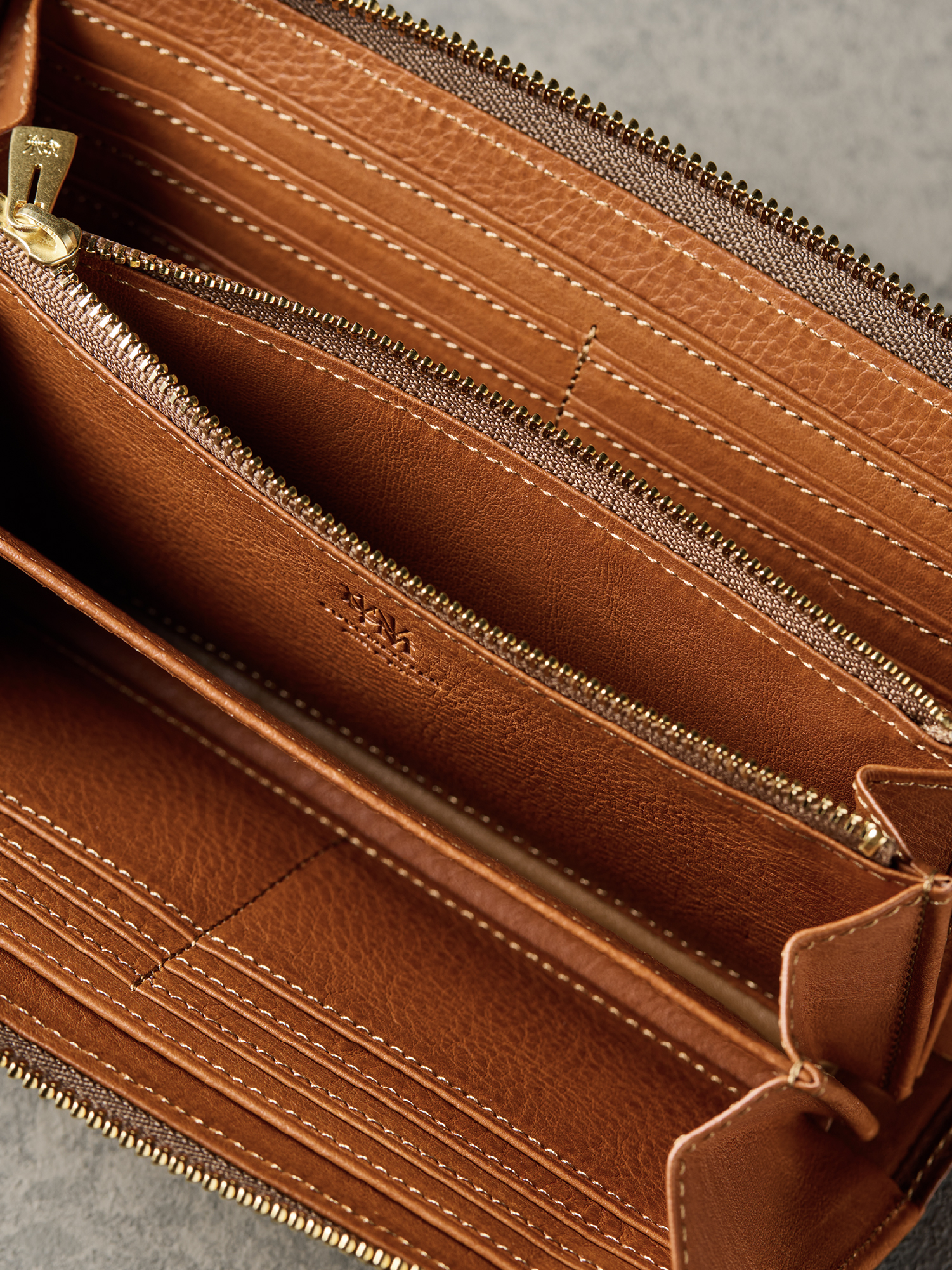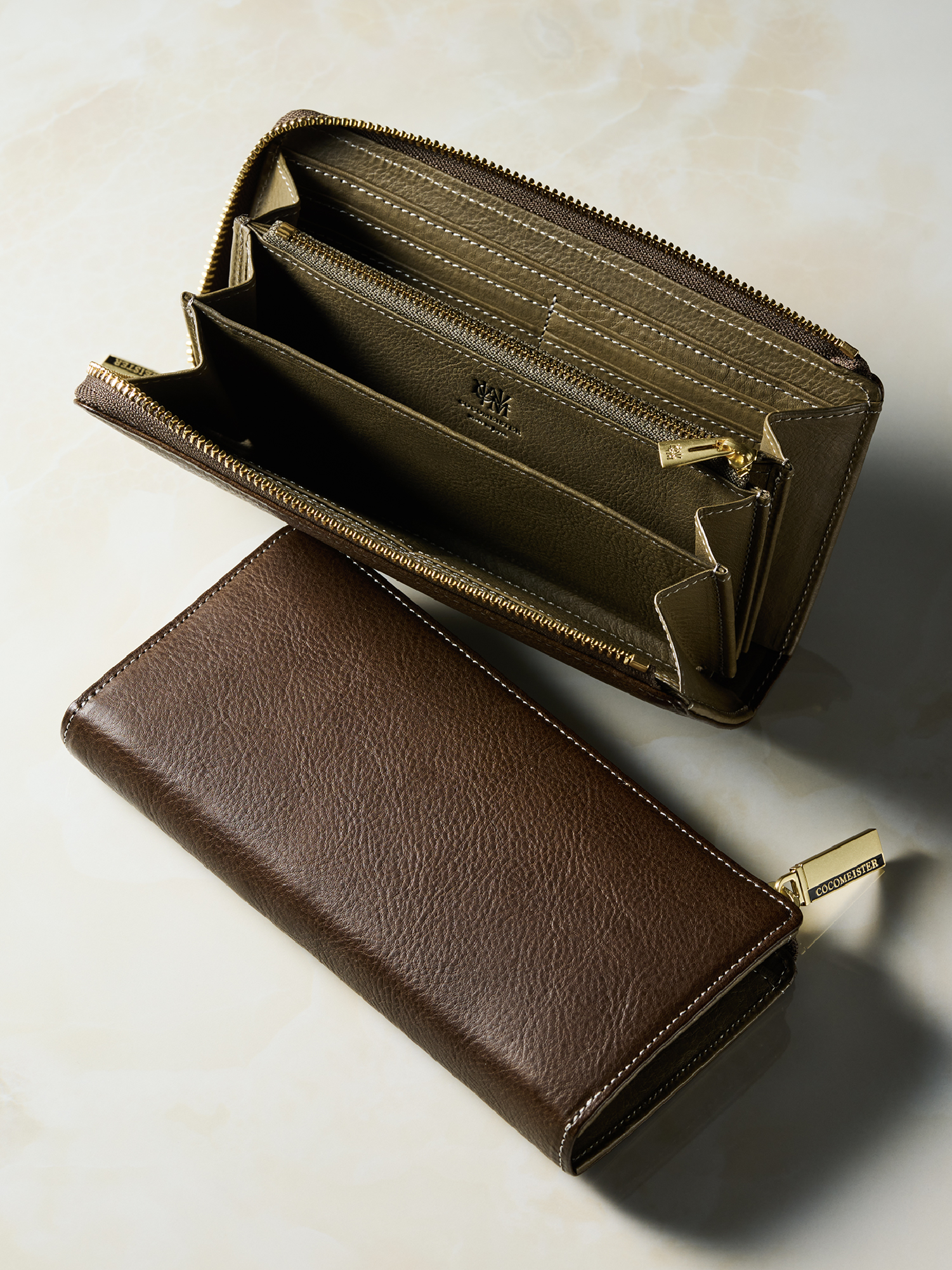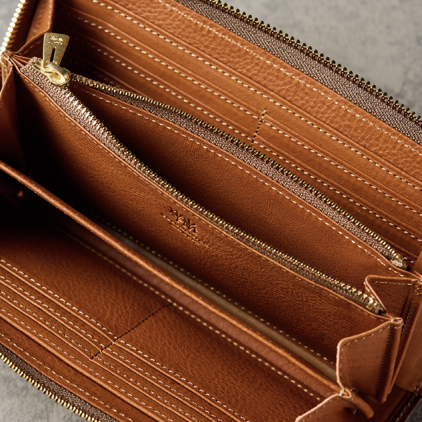 L字ファスナーは軽く開き、蛇腹マチが大きく広がるため中身を一望できます。中央に小銭入れ、左右にカード段12、フリーポケットも複数備え、紙類の整理まで自然にできる構造。紙幣は折らずに収納可能で、動線が整った“気持ちの良い使い心地”が魅力です。