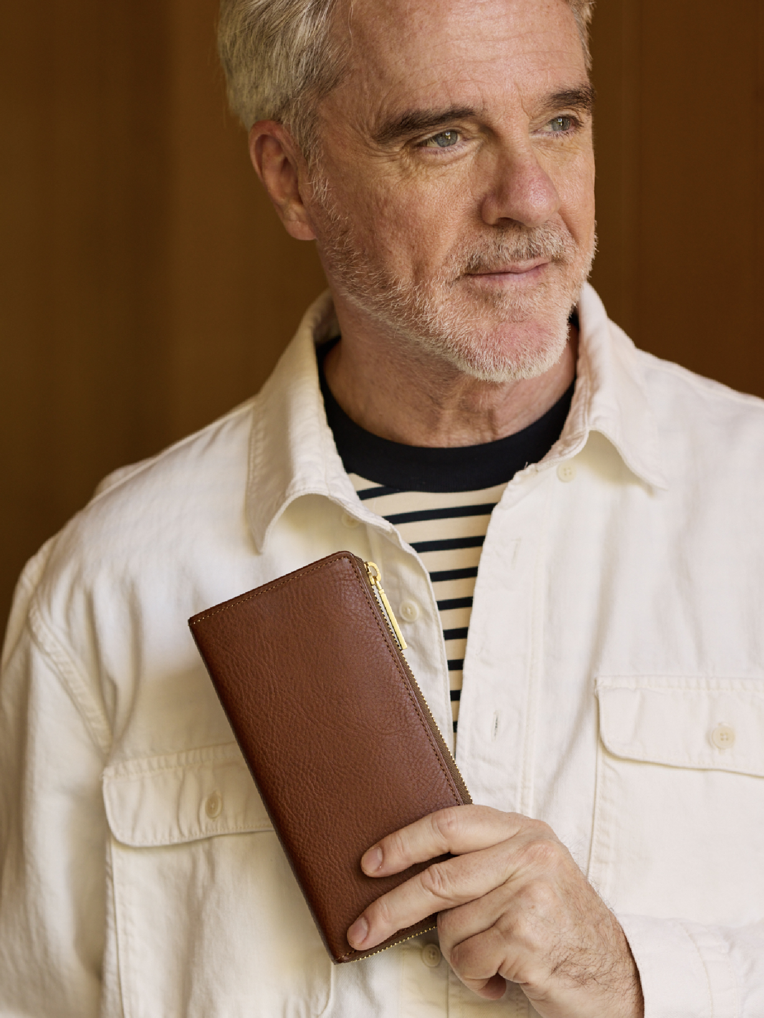 モデルが手に持ったカットは、サイズ感と使いやすさが直感的に伝わります。スリムに収まり、革の質感も手元で美しく映える自然体の印象。