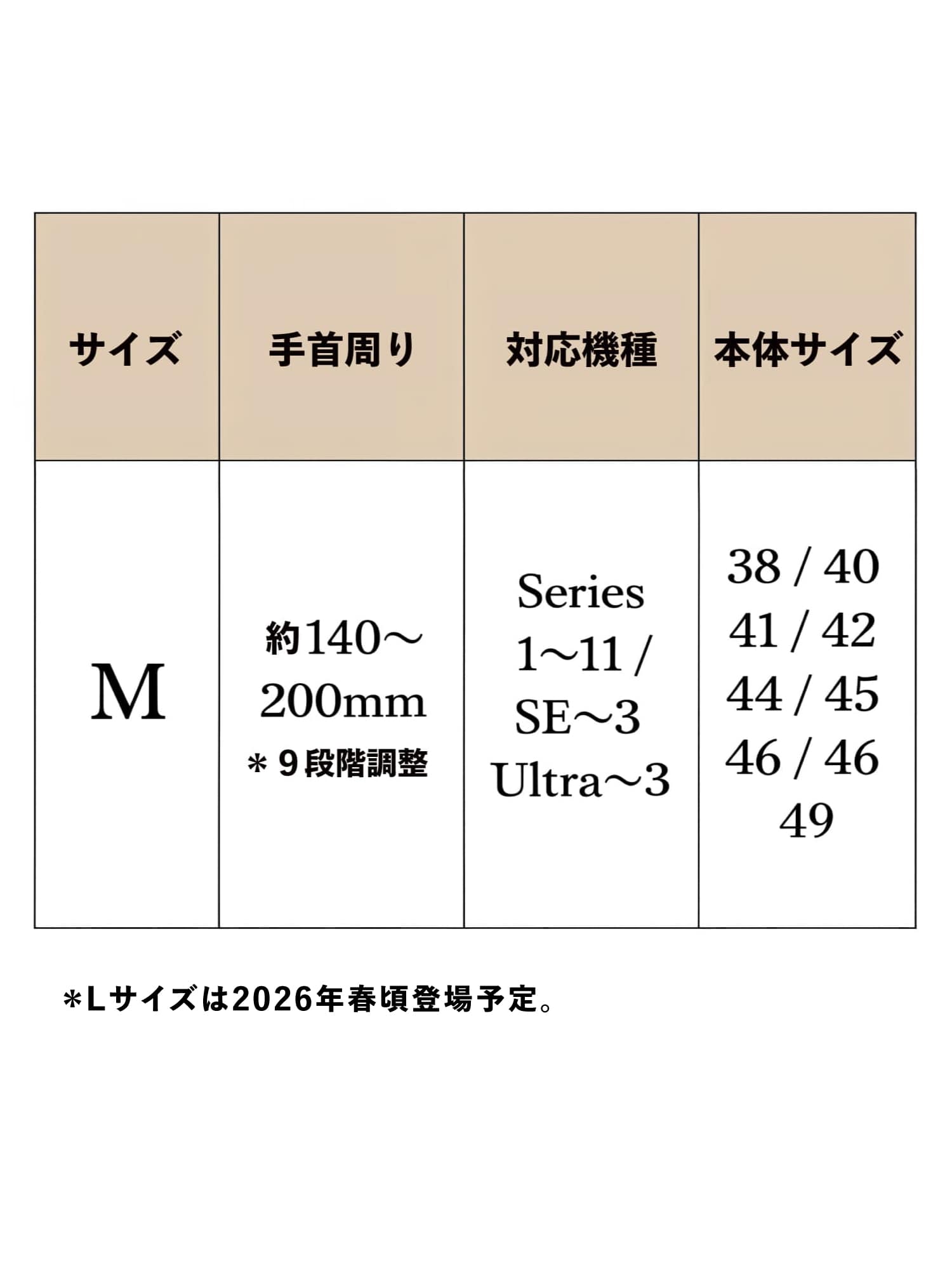 Apple Watchバンドは現在 Mサイズのみ ご用意しています。Mサイズは 38・40・41mm に加えて、44・45・46・49mm でも装着可能な汎用性の高い仕様です。手首周り 約140〜200mm に対応し、9段階調整により細かなフィット感を得られます。