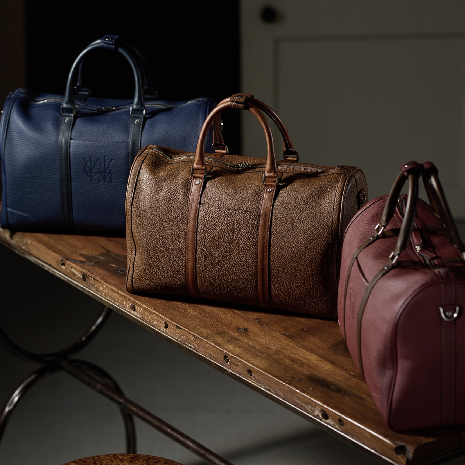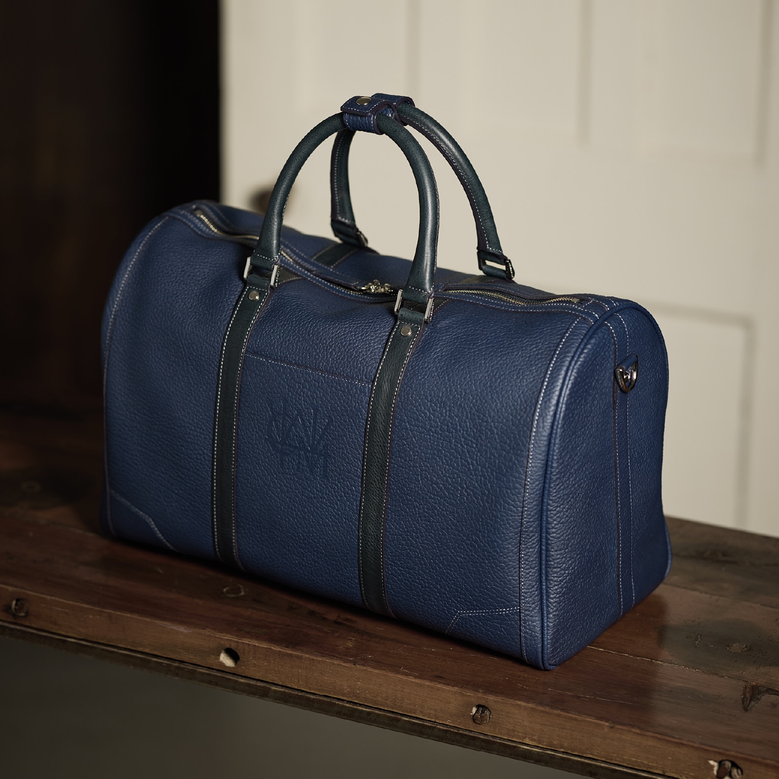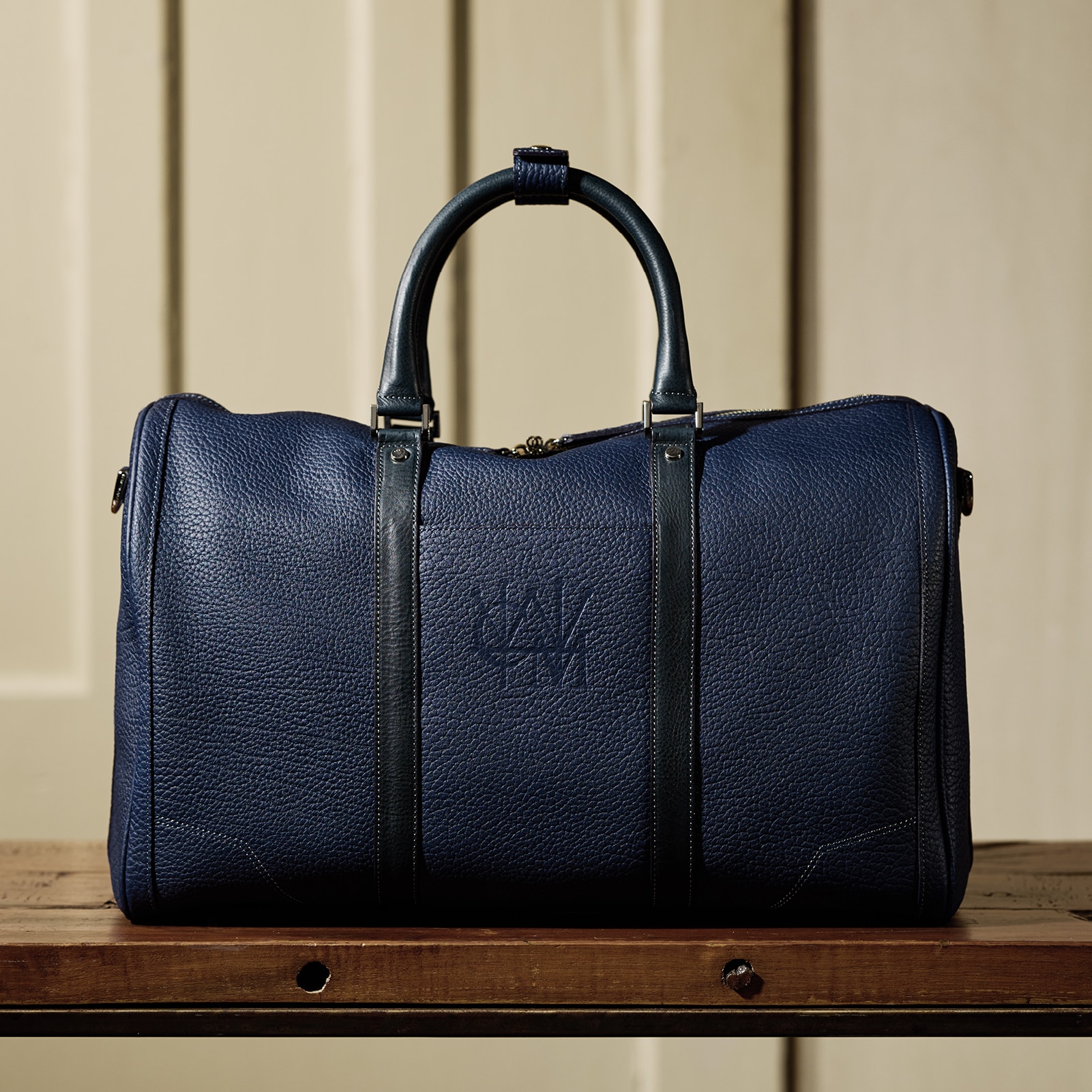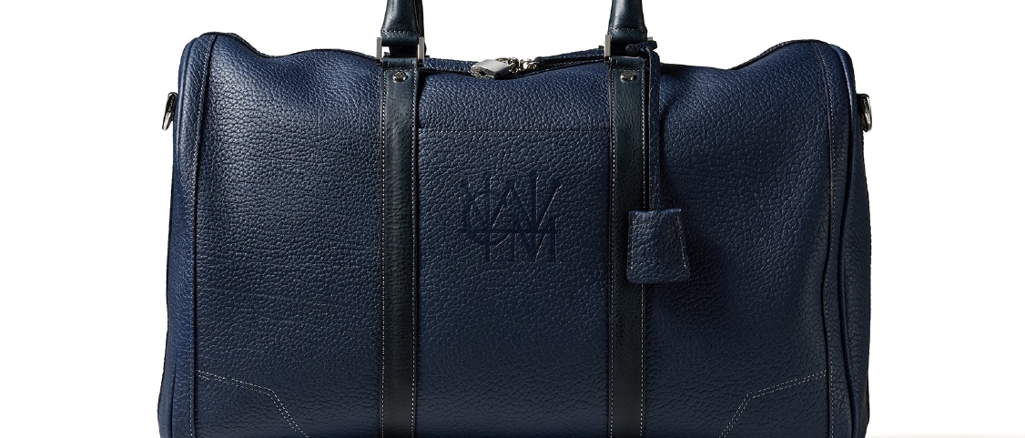 全体をネイビーカラーで統一し、シュリンクレザーはフランス、マルティーニレザーはイタリアの異なる国のネイビーを楽しむことが出来ます。発色も控えめで、エレガントな印象が特徴です。それでいて、どんな場所でも使える天然皮革らしい気軽さが魅力です。