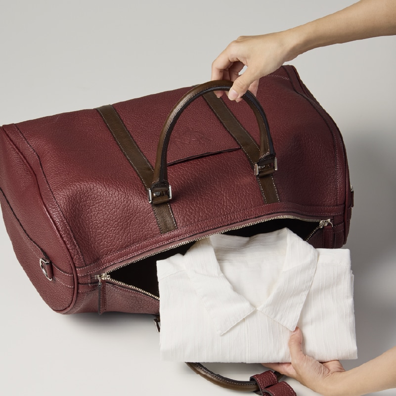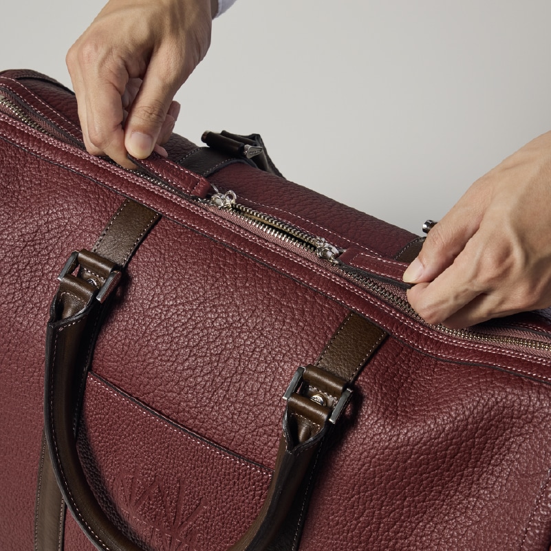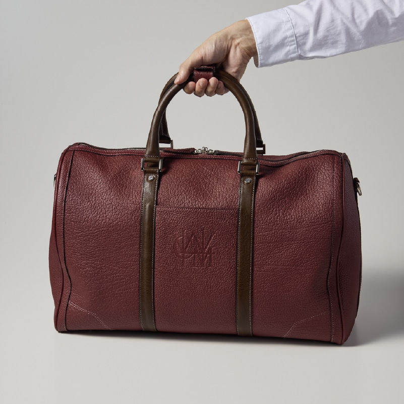 フランスシュリンクレザーを全面に使用し、上質感と軽量さで魅了するボストンバッグ。1泊2日程度の出張から、ゴルフでの使用をイメージしたボストンバッグ。持ち手にはマルティーニレザーを使用していますので、経年変化も楽しむことが出来ます。内装はスエードレザーを使用しており、肌触りと優雅さが魅力のバッグです。