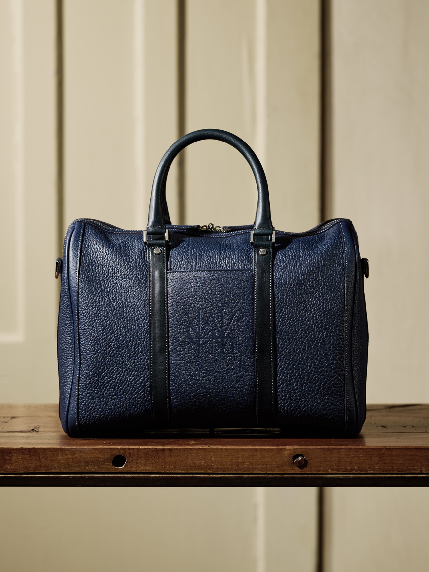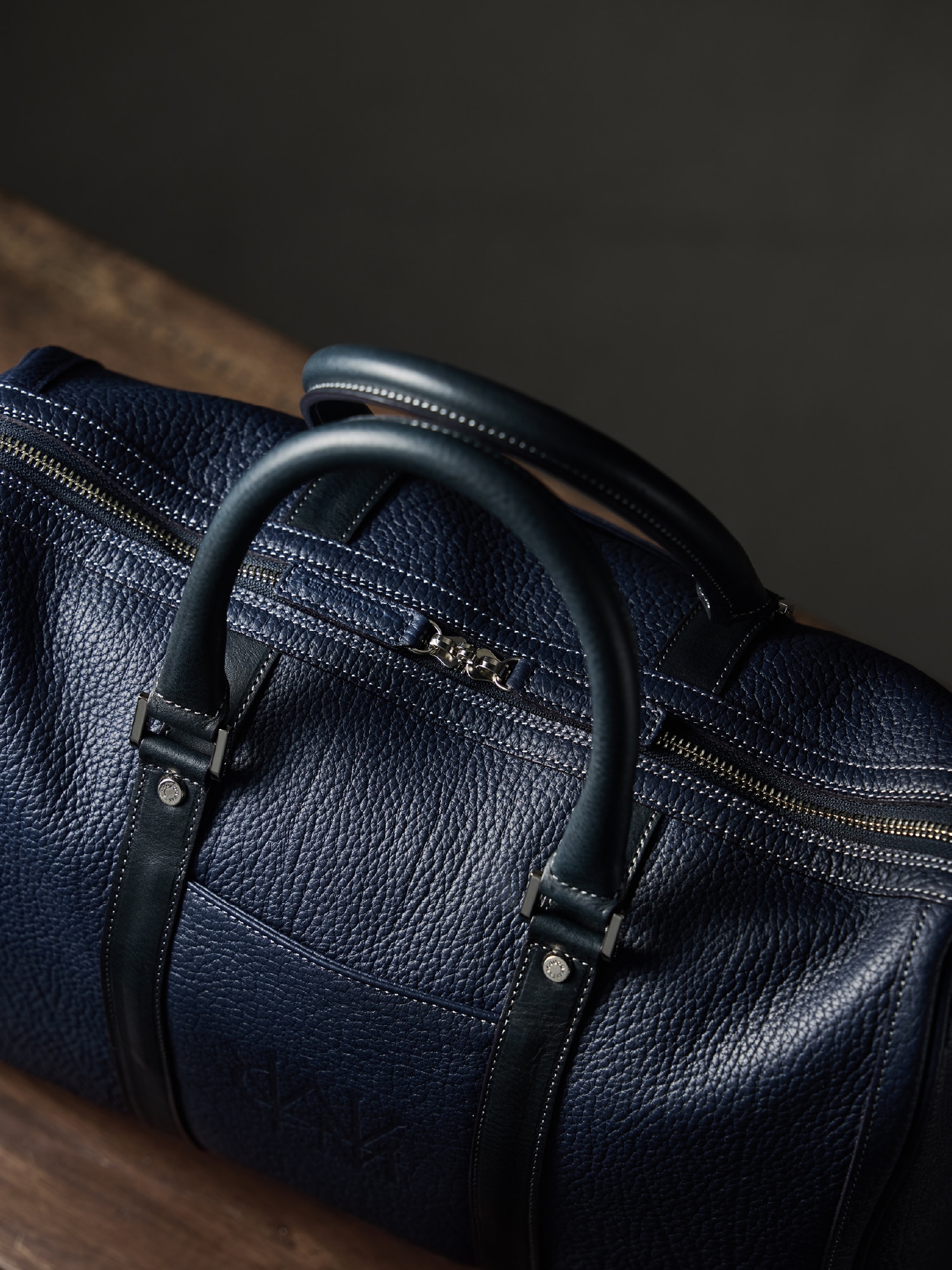 全体をネイビーカラーで統一し、シュリンクレザーはフランス、マルティーニレザーはイタリアの異なる国のネイビーを楽しむことが出来ます。発色も控えめで、エレガントな印象が特徴です。それでいて、どんな場所でも使える天然皮革らしい気軽さが魅力です。