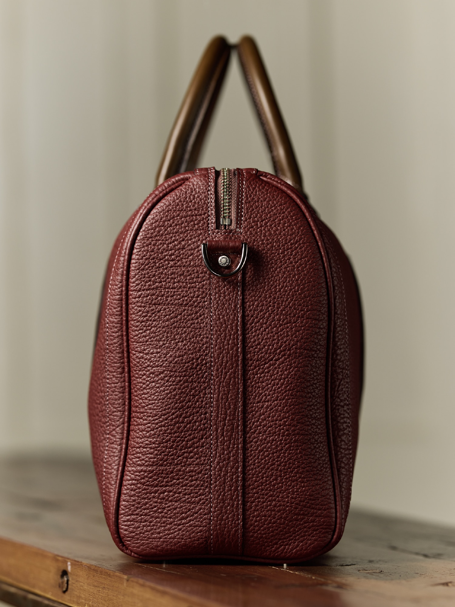 フランスシュリンクレザーを全面に使用し、上質感と軽量さで魅了するボストンバッグ。1泊2日程度の出張をイメージした丁度良いサイズ感のスマートボストンバッグ。持ち手にはマルティーニレザーを使用していますので、経年変化も楽しむことが出来ます。内装はスエードレザーを使用しており、肌触りと優雅さが魅力のバッグです。