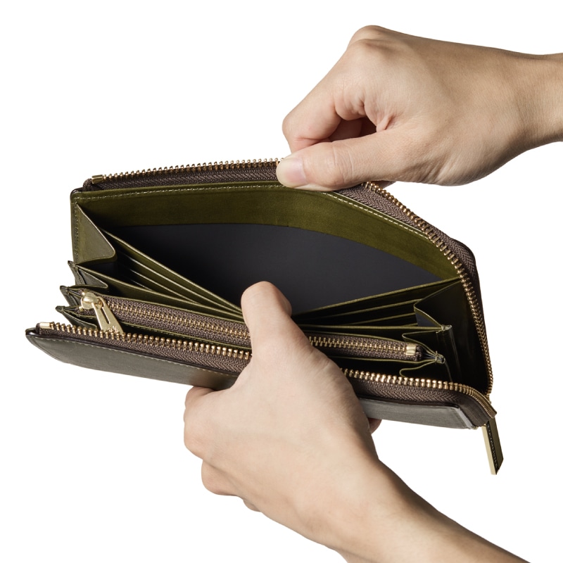 Detail 05無駄を削ぎ落としたスリムなフォルムが、洗練された印象を与えます。職人の精巧な仕立てにより、美しいシルエットを実現し、使うほどに手に馴染んでいきます。収納力を保ちつつ、かさばらないスマートなデザインです。