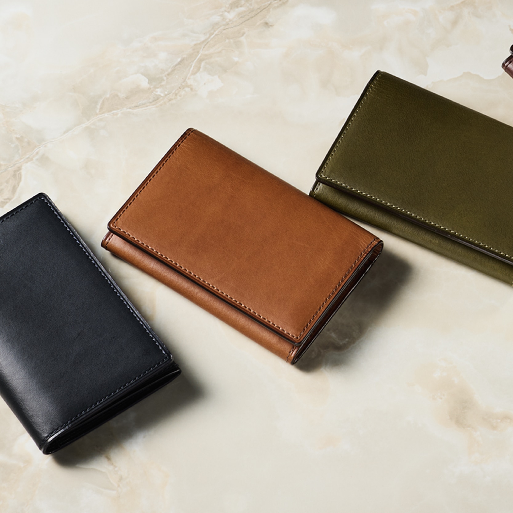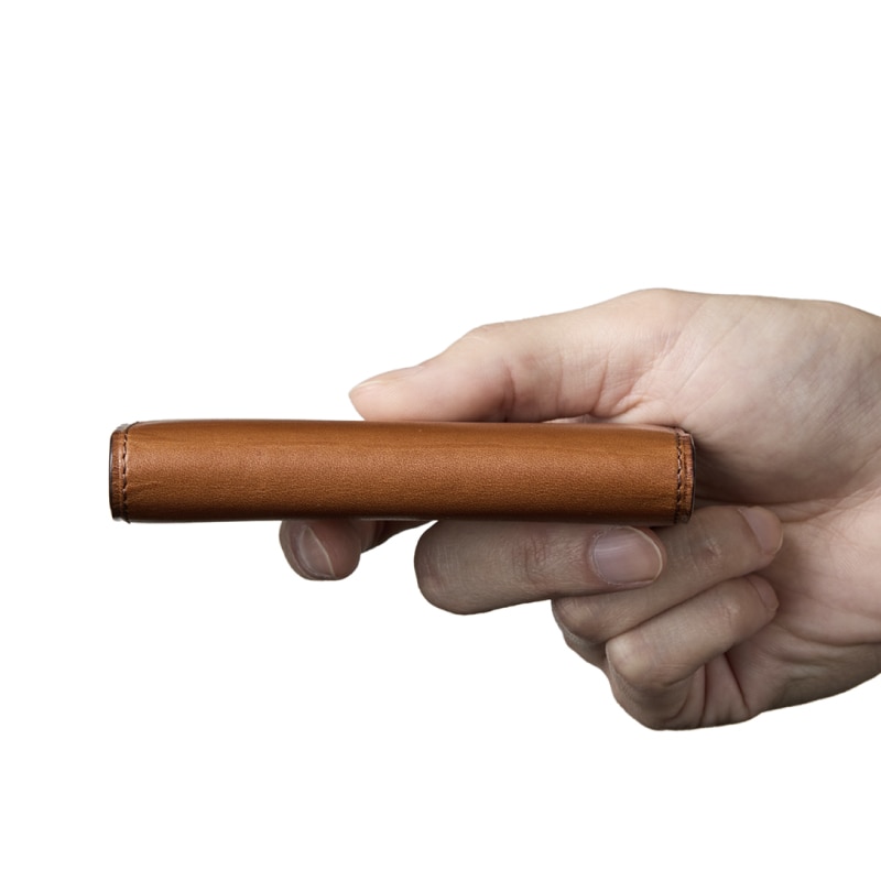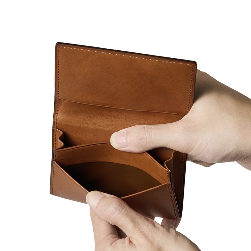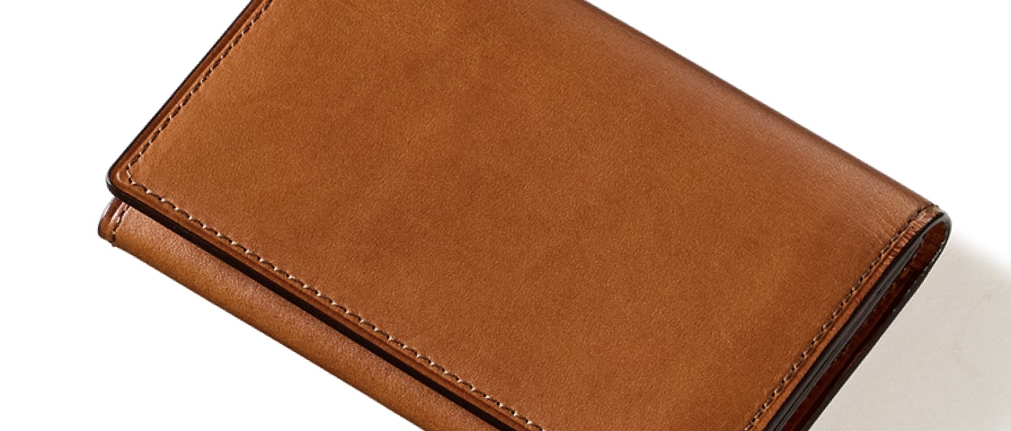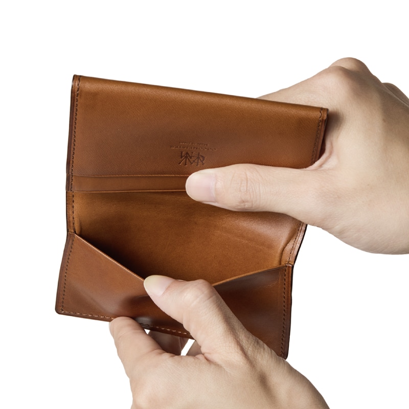 革を折りたたむデザインで、上品さを醸し出す極上の名刺入れです。革を薄くし、場所ごとに厚みを調整するこだわりにより、パタンとフタが閉じる名刺入れが誕生します。細部にまで熟練した職人技を使用しています。