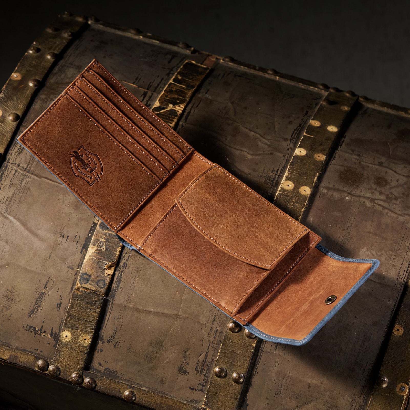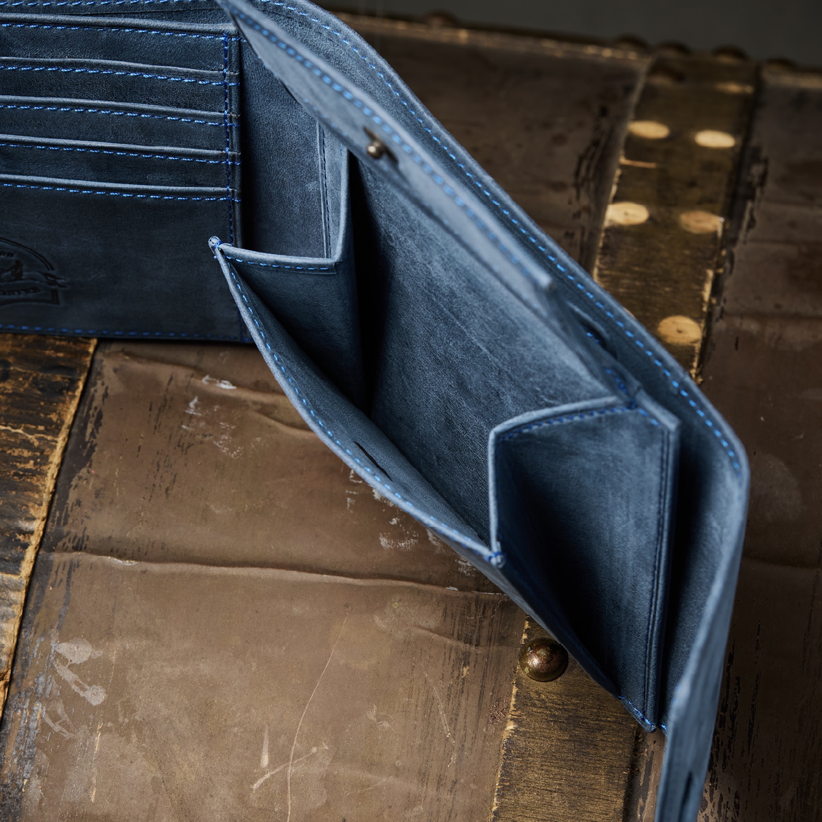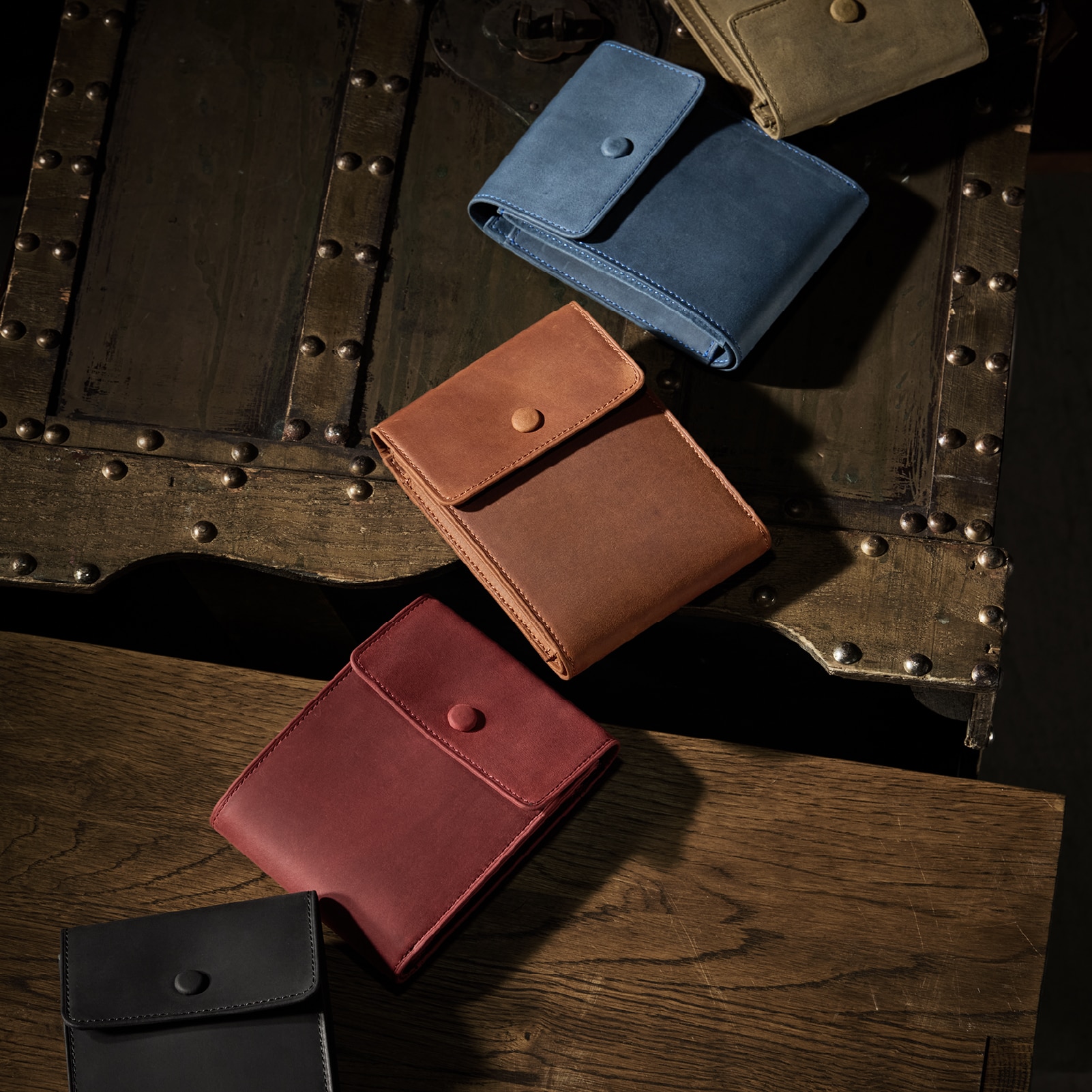 瞬く間に経年変化するイタリア産オイルドヌバックが魅了します。今までに経験したことがない質感が魅力的で、しっとりと手に馴染みます。柔らかい革のクッタリ感も楽しめます。ウォレットチェーンを装着できるDカンを装備した、ボタンで留めるタイプの3つ折り財布です。ホールド感があり、お洒落なフォルムで経年変化を楽しめます。