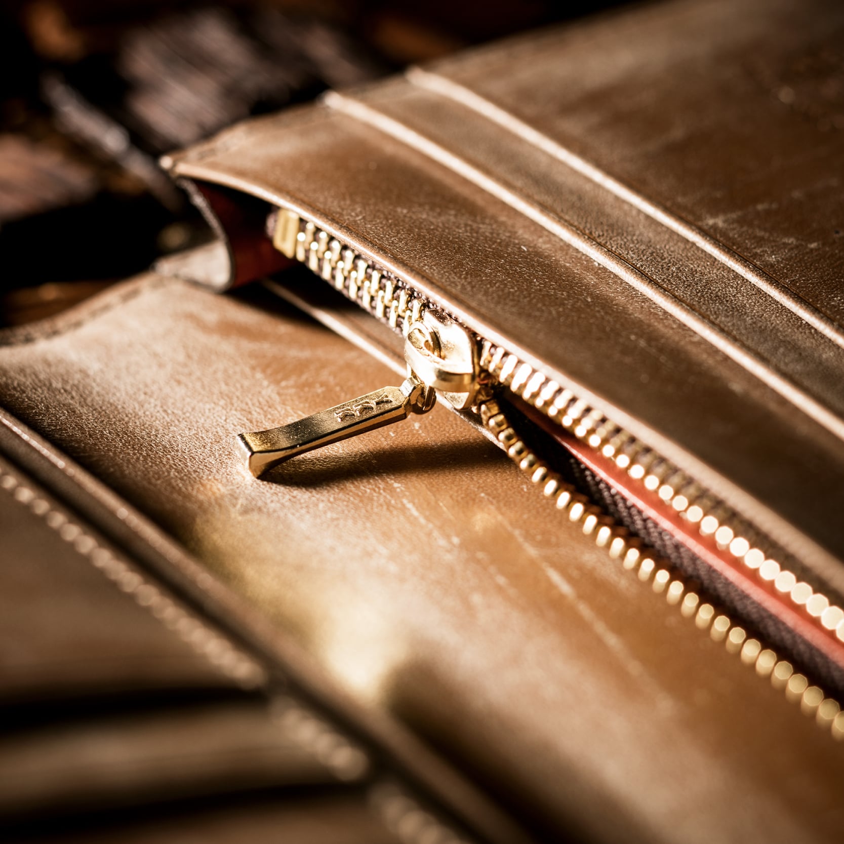 Detail 01手に持っても様になる重厚なフォルムがこのラウンドジップ長財布の人気の秘訣です。手に持って歩いてもお洒落、鞄に入れても格好よく手に馴染む革の質感もお洒落です。