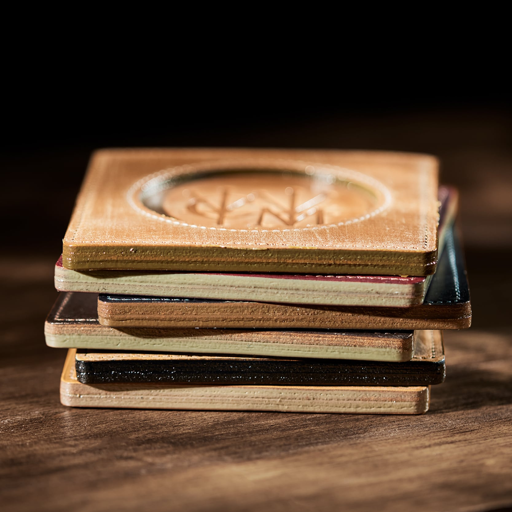 FINESTRAコースターは、窓をイメージしてデザインしたコースターです。グラスを置く面がくり抜いて見えるデザイン。革を重ねることで、弾力性とレザー感を楽しめます。