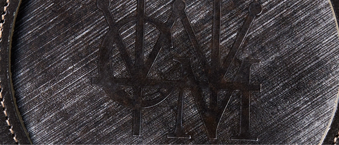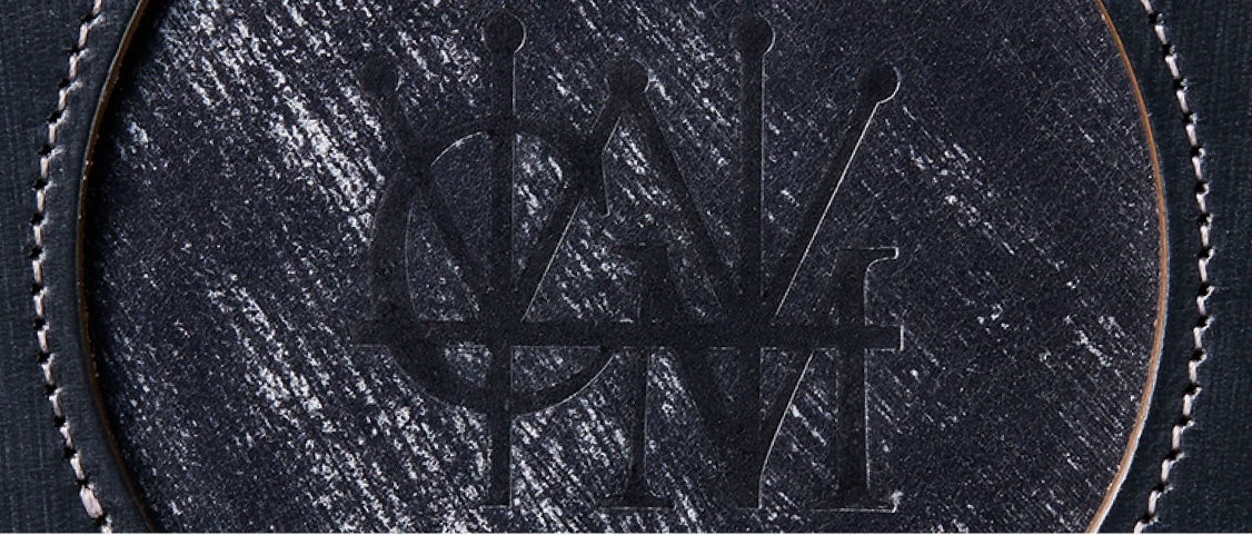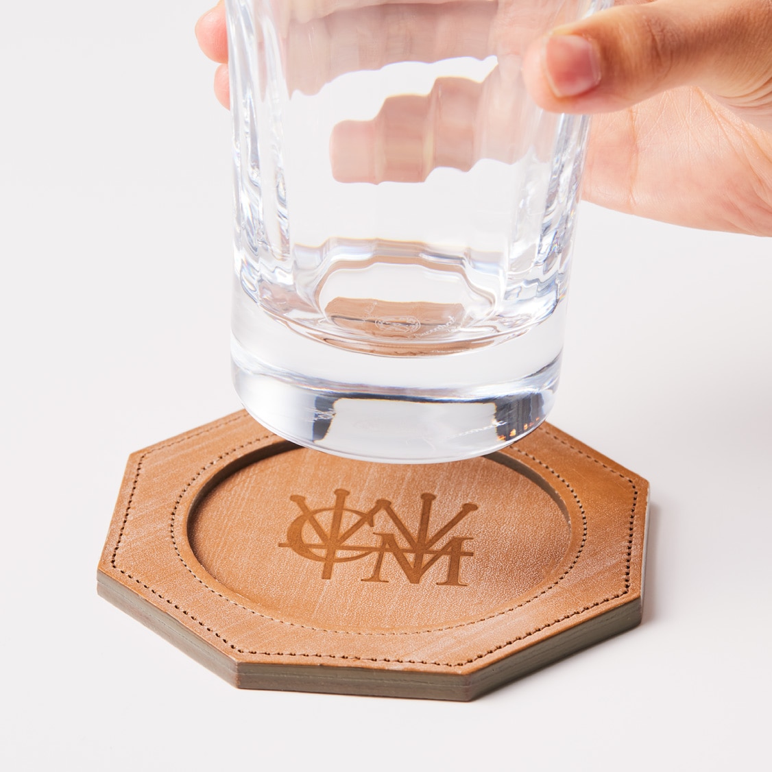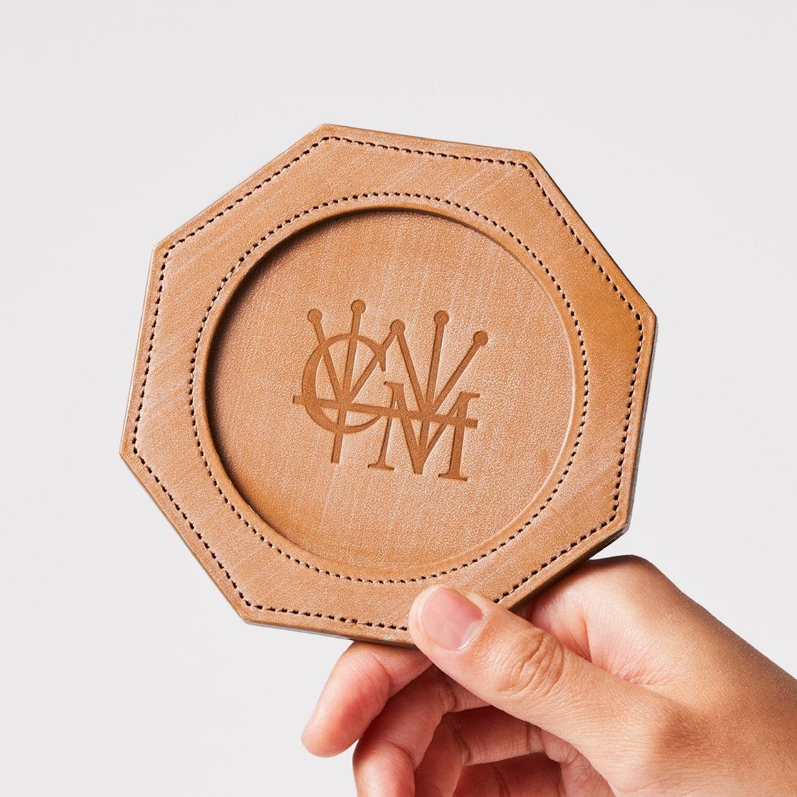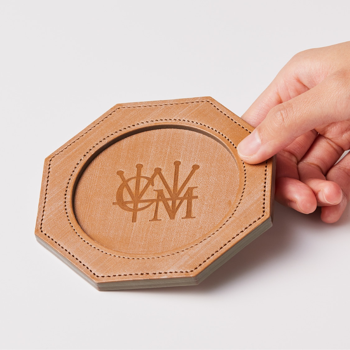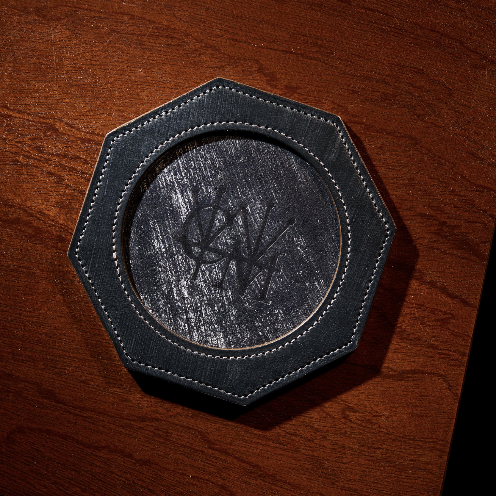 Detail 03シンプルにロゴを刻印しており、この上にグラスを置きます。グラス越しに模様がじんわりと見えますので、革の濃淡を楽しめます。