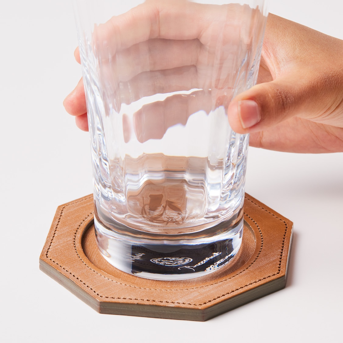 *円の直径が7.5cmですので、グラス底面の大きさをご確認ください。また革には防水加工などを施していませんので、グラスの水滴でシミになる場合がございます。革の風合いとしてお楽しみください。