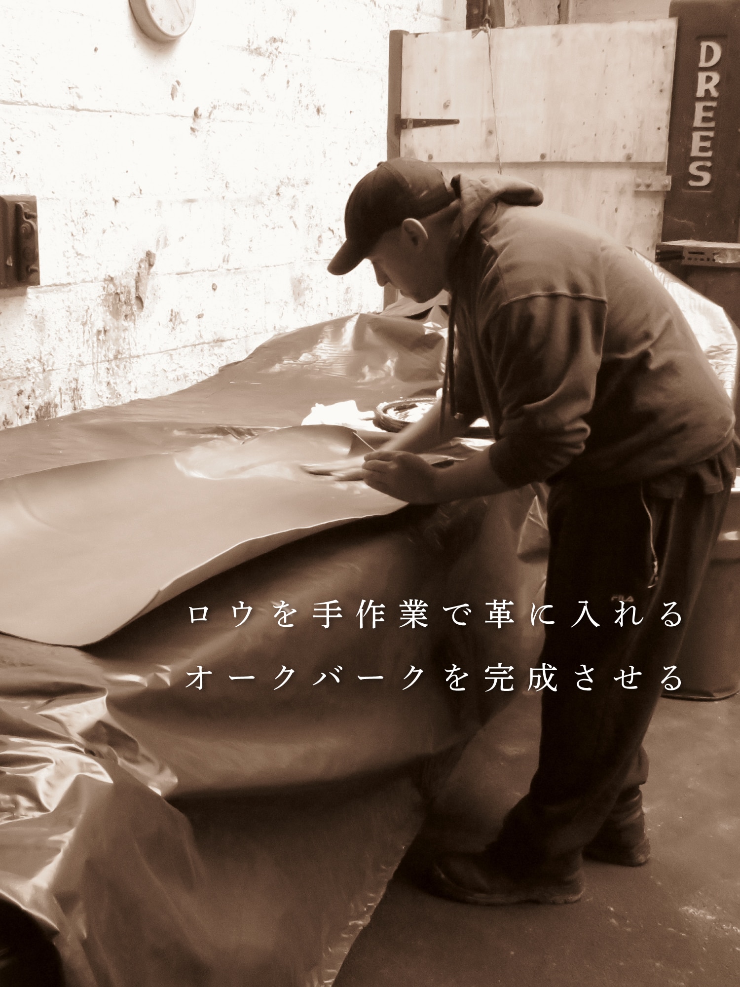 英国タンナー近くにある保護されている区域で伐採したオークを使用し、薬品を一切使わずに革を製造するオークバーク。オークバークは製作日数は、365日と1日かけると言う鉄の掟が英国で生まれました。それは樹木の保護の為と言い伝えられています、かつて英国では、鉄の掟を破りし者は両手首を切り落とされるという、厳しい罰が設けられていました。オーク(樹木)そのものを保護し、品質を保ち続けます。(現在このタンナーは英国政府の管理下)