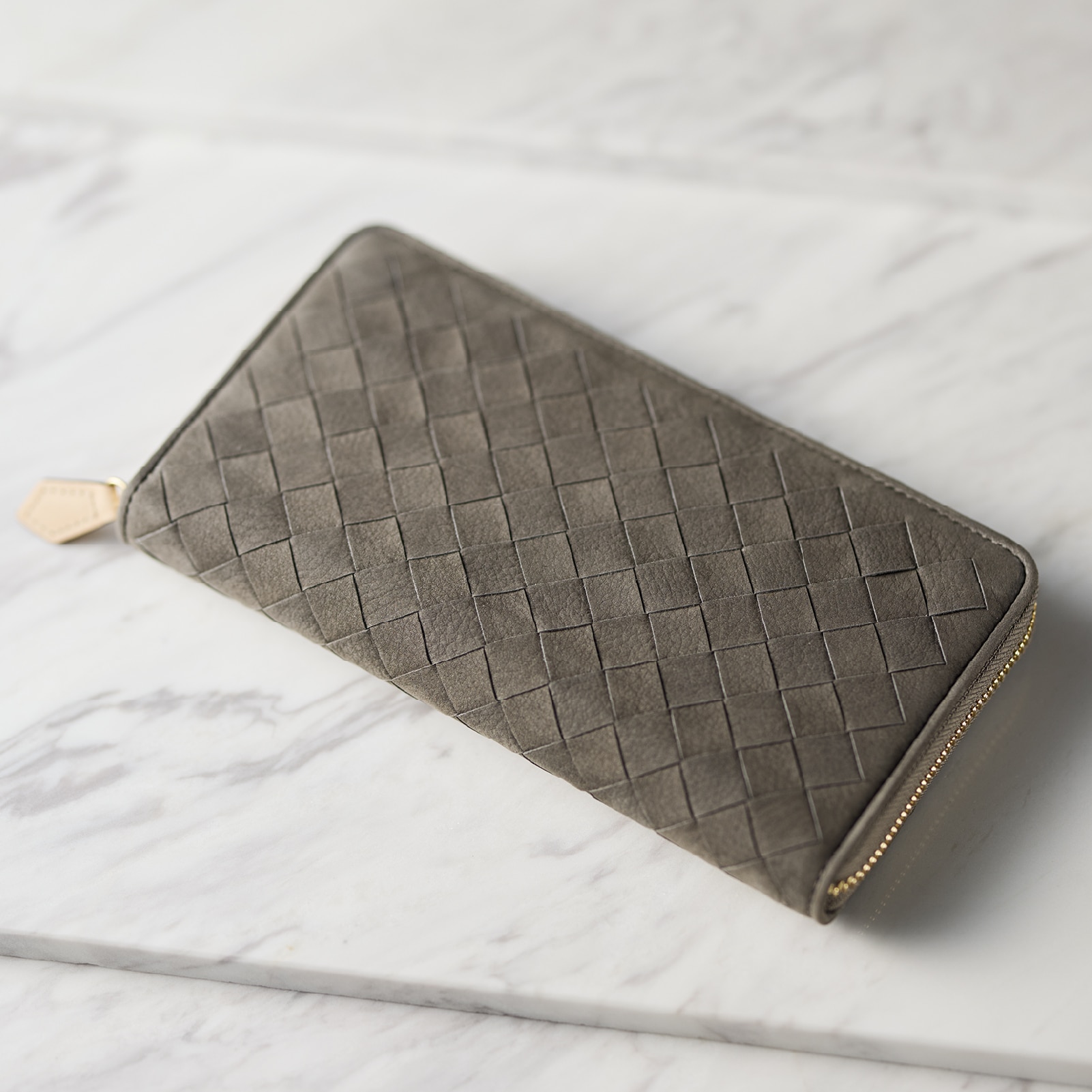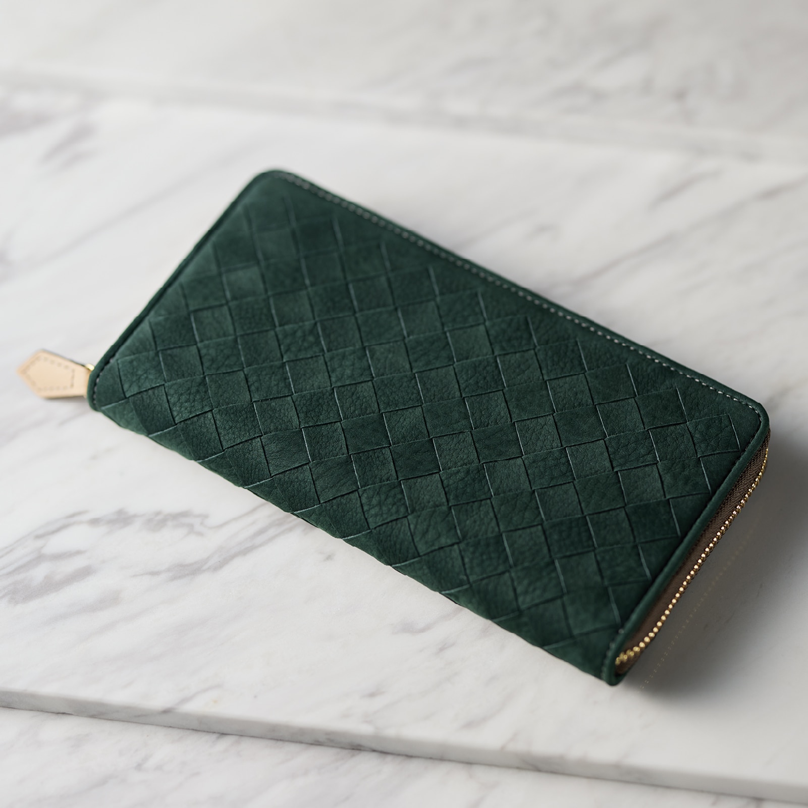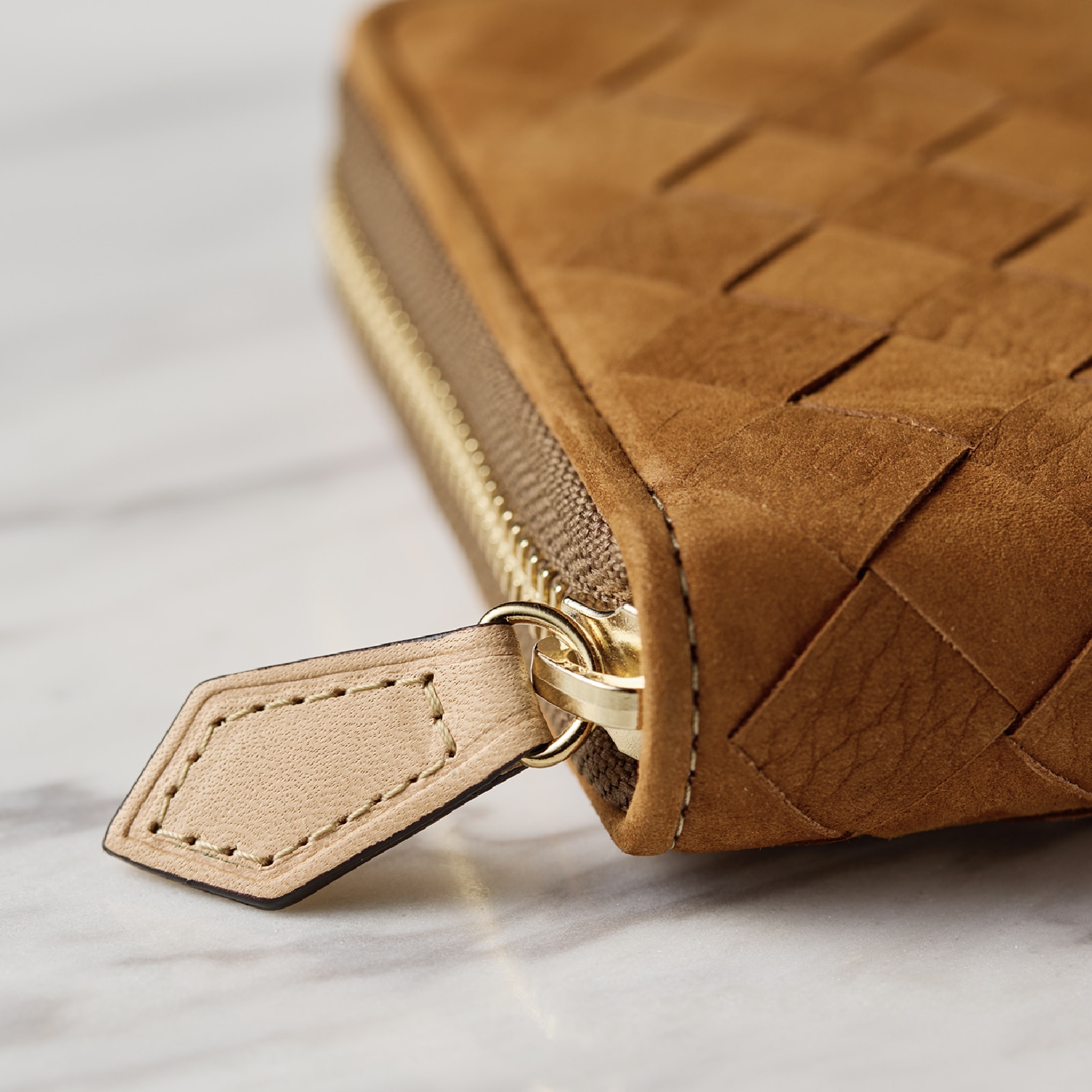 スペイン原皮の最高級ヌバックを丁寧に編み上げ、日本の熟練職人が一点ずつ仕立てています。編み込みが生み出す陰影と起毛の柔らかさが融合し、手に吸い付くような質感と重厚感を楽しめます。