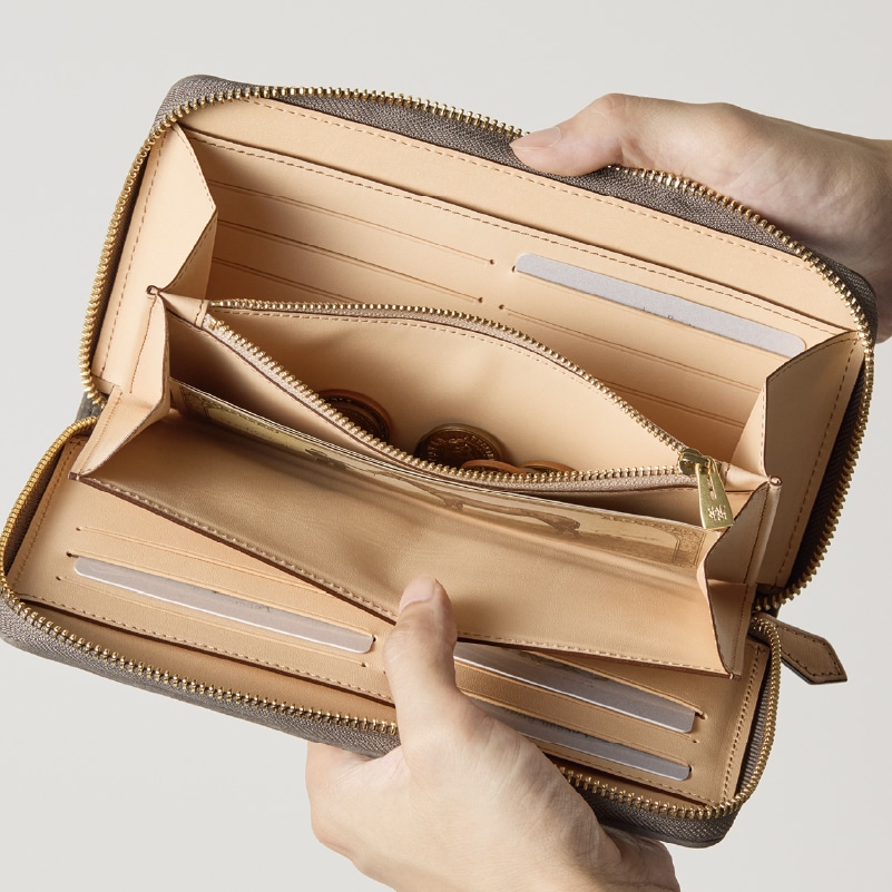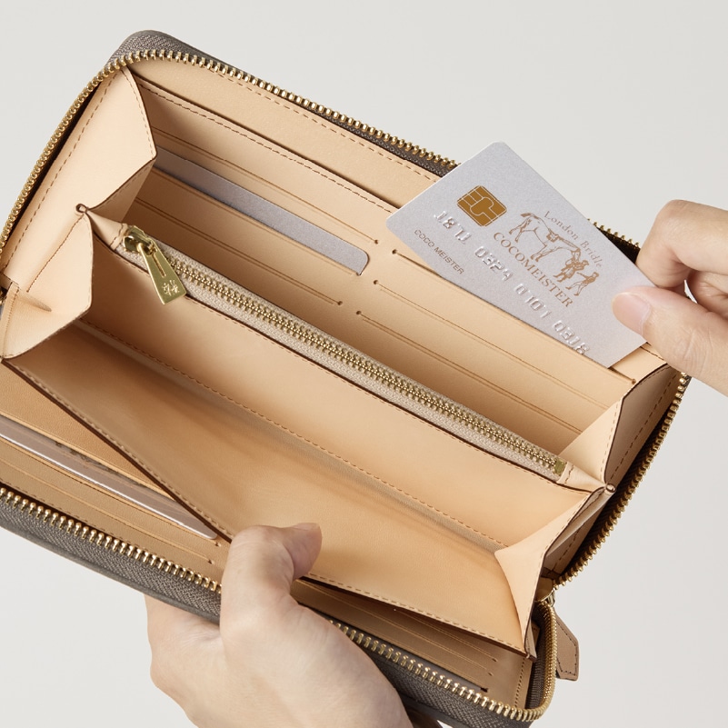 Detail 012つの札室と小銭入れを中心に、多くのカード段を配置したセパレート大容量設計。視認性と整頓性に優れ、中身が一目で把握できます。収納力と機能美を両立した構造です。