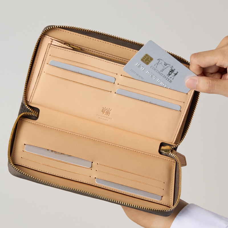 Detail 02片面に計8枚のカードが美しく収納できる構造。中央にはココマイスターのロゴを素押しで刻印。使いやすさと上品さを兼ね備えた、見た目にも美しい内装です。