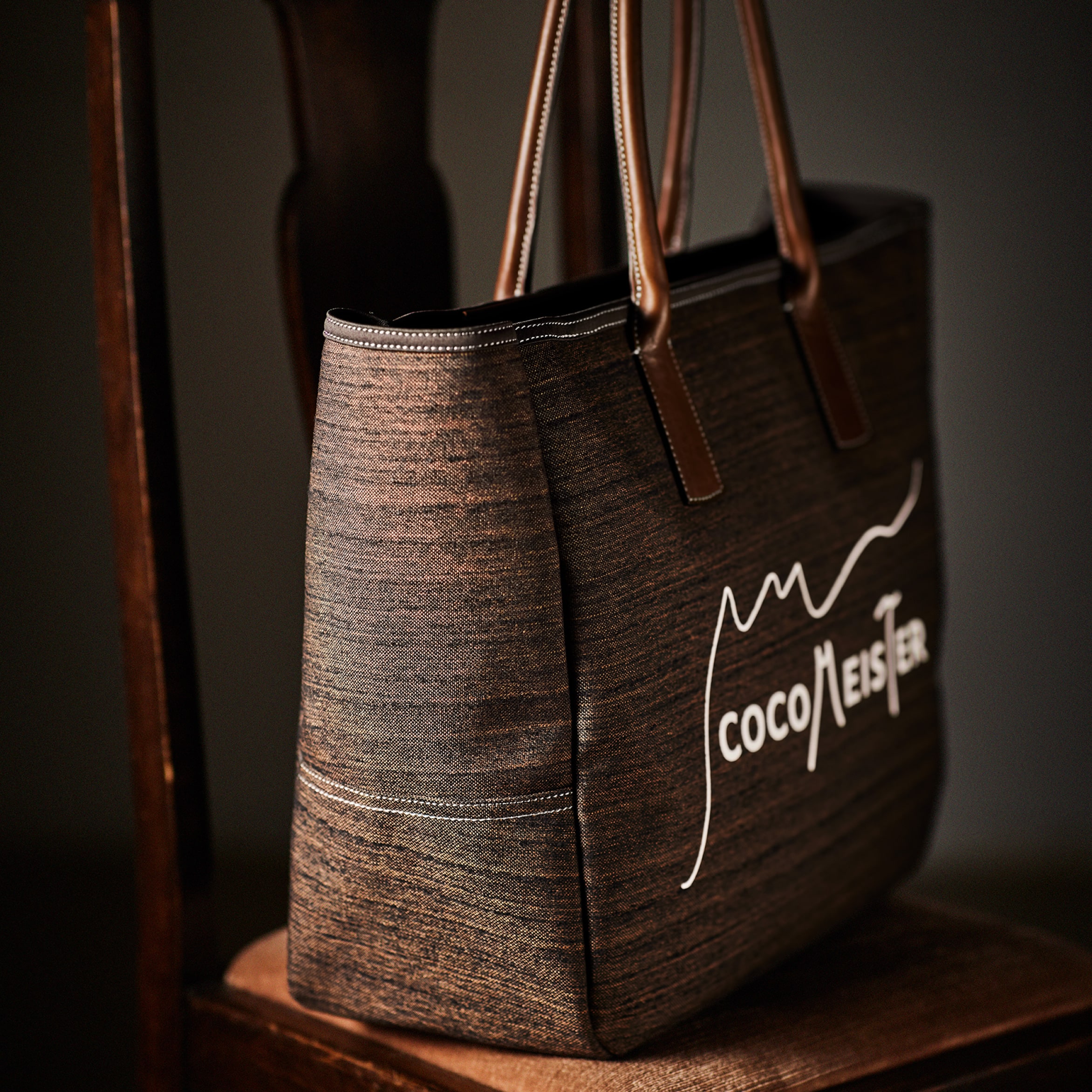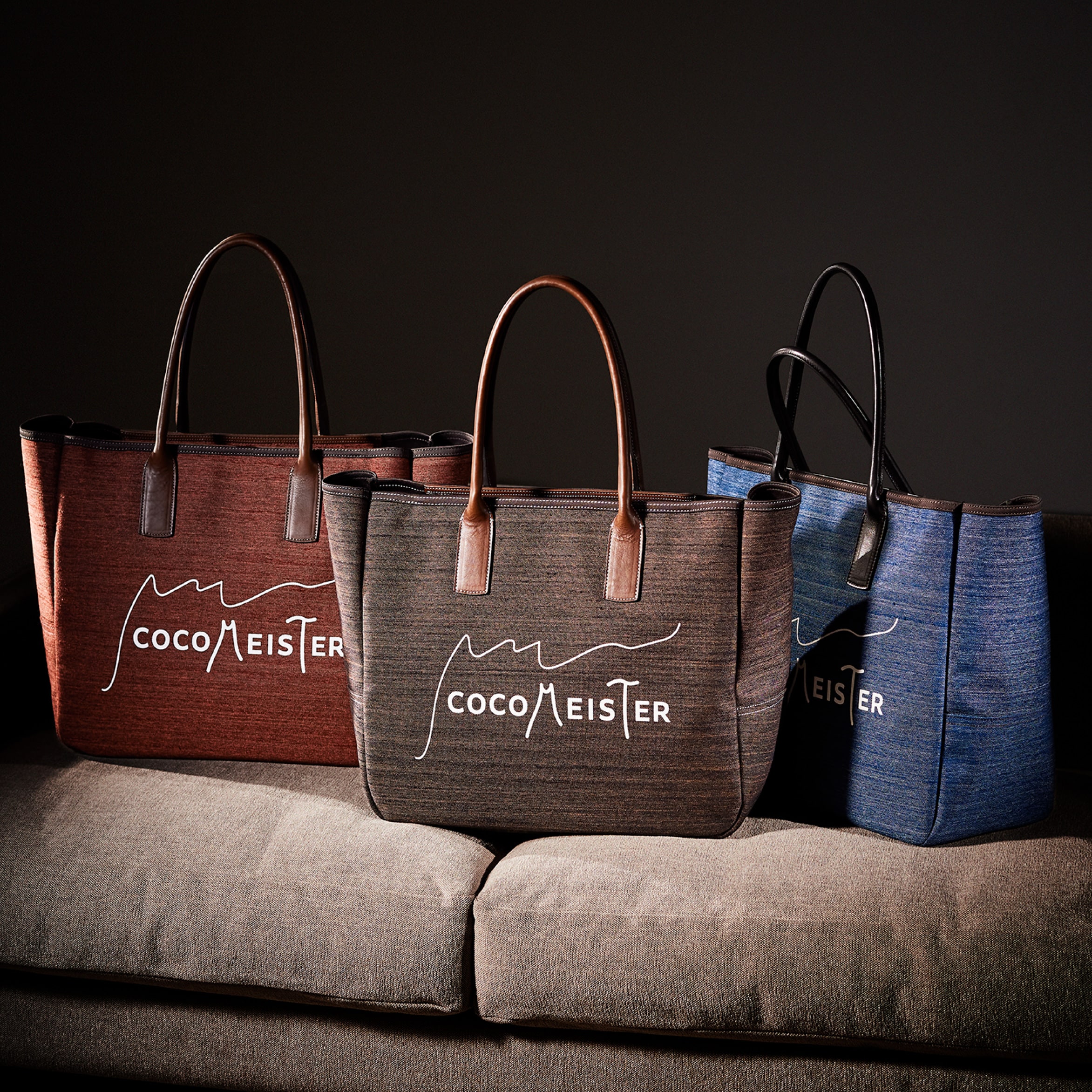 大判のトートバッグで、持ち手や内装の細かいところにはイタリアンレザーを使用しました。生地とレザーのコンビネーションがお洒落なデザインです、リラクゼーション感を出すために、オリジナルのココマイスターロゴを制作し、外装にシルクスクリーンにより印刷しています。