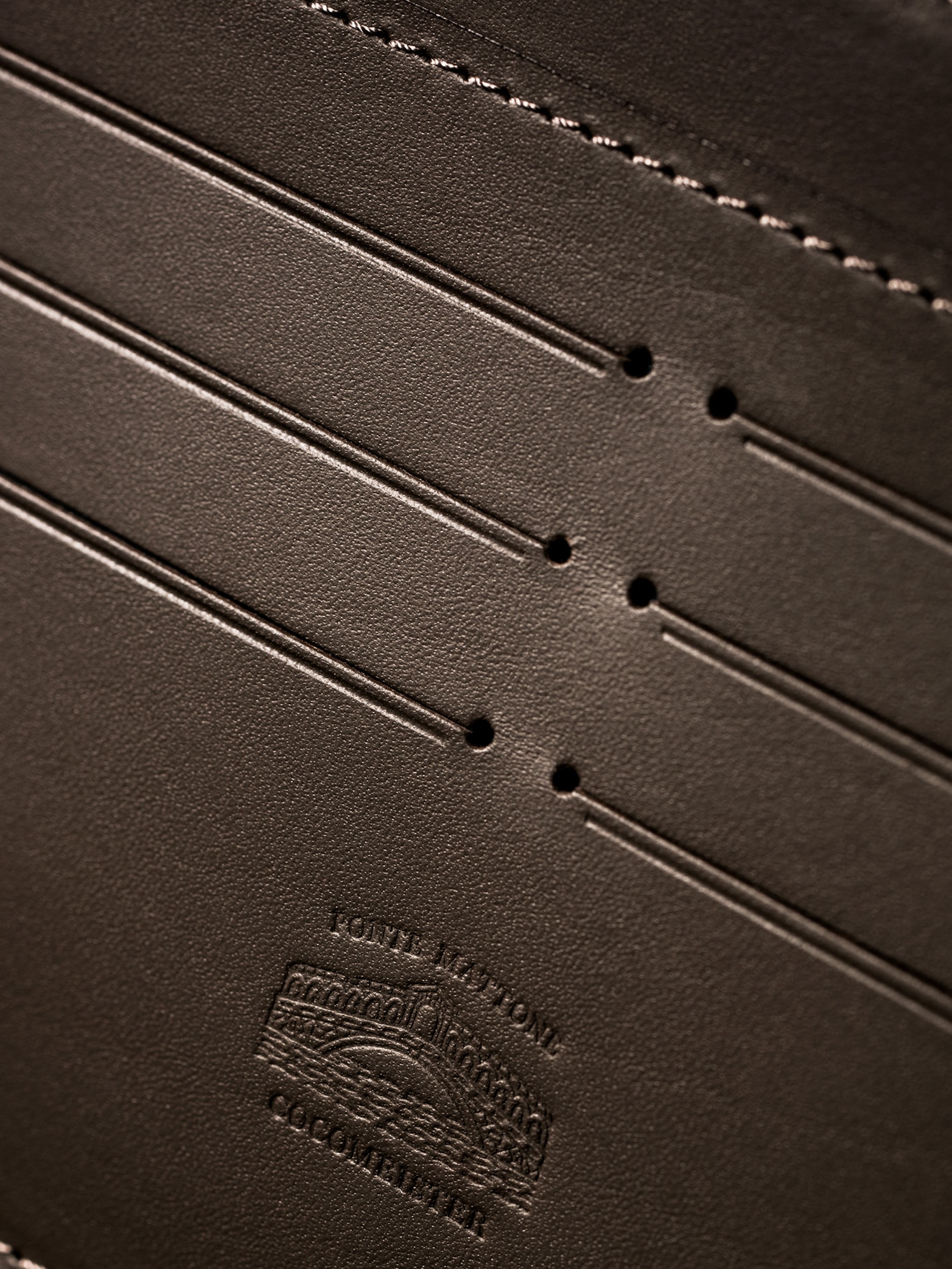 内装にはベルギー産のアマンデルレザーを採用しています、染料と顔料のハイブリッドな色付け方法、鞣し方はバランスが良く、革らしい質感もありながら、シックな大人のレザーを感じさせてくれます。マットーネとの相性も良く、とても格好良いレザーアイテムに仕上がっています。革の中では珍しいベルギー産も希少性が高く、楽しめるポイントです。