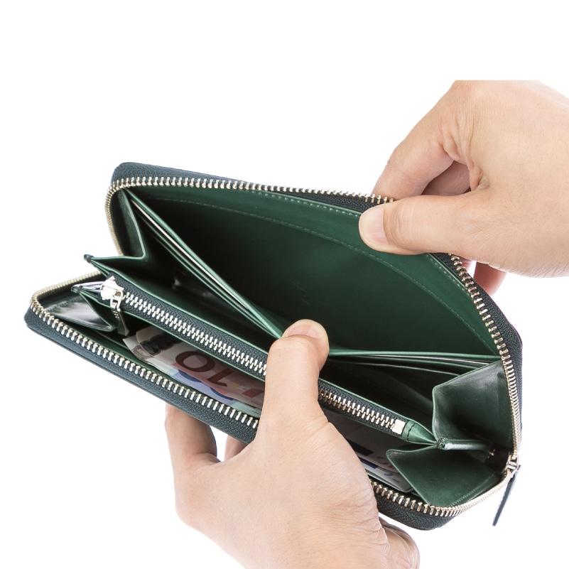 Detail 03左右にカードポケットが4つずつ、両サイドにマチ付きポケットがあり、お札やレシート類などを分けて収納できます。