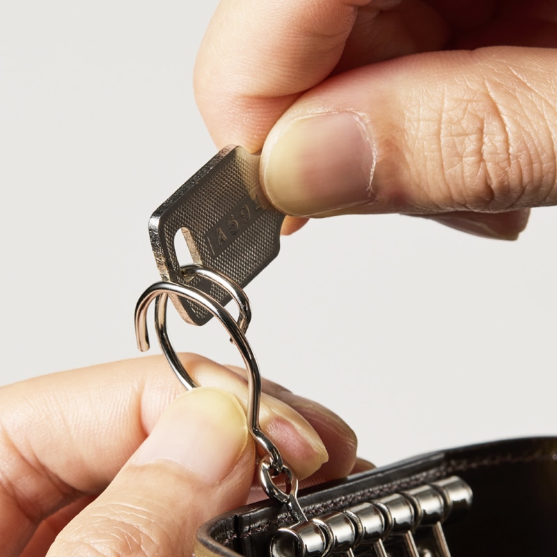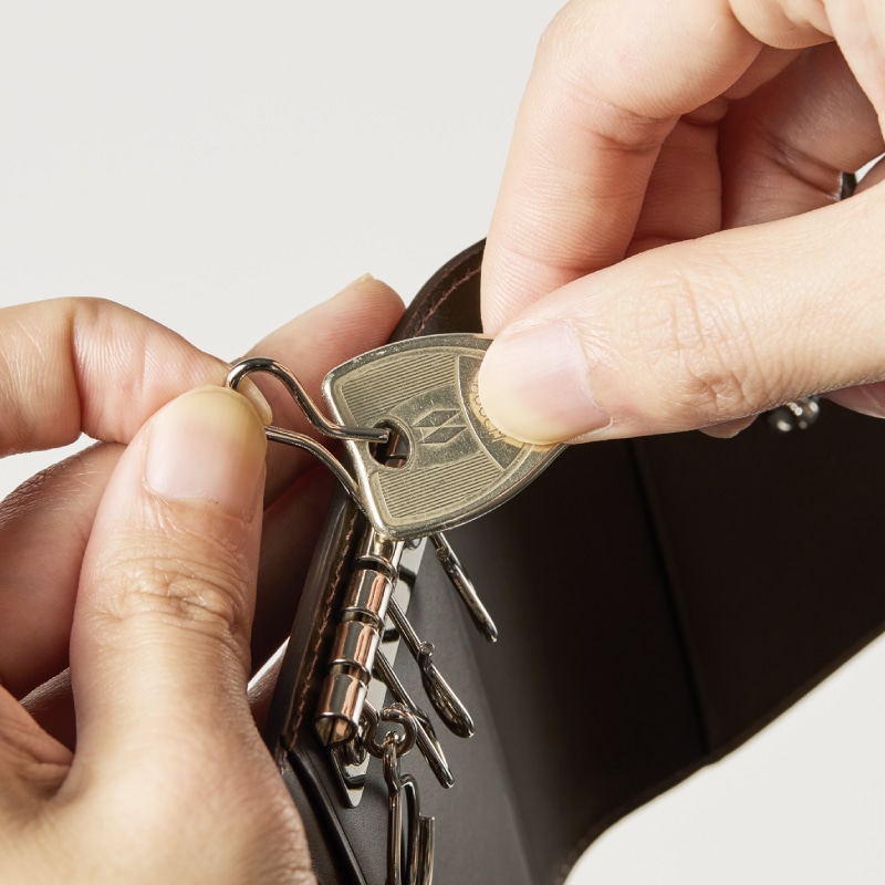 Detail 02一番左側に大リング、右側に4つの鍵接続スペースがあります。金具はシックにシンプルスタンダードなシルバー色を採用しています。