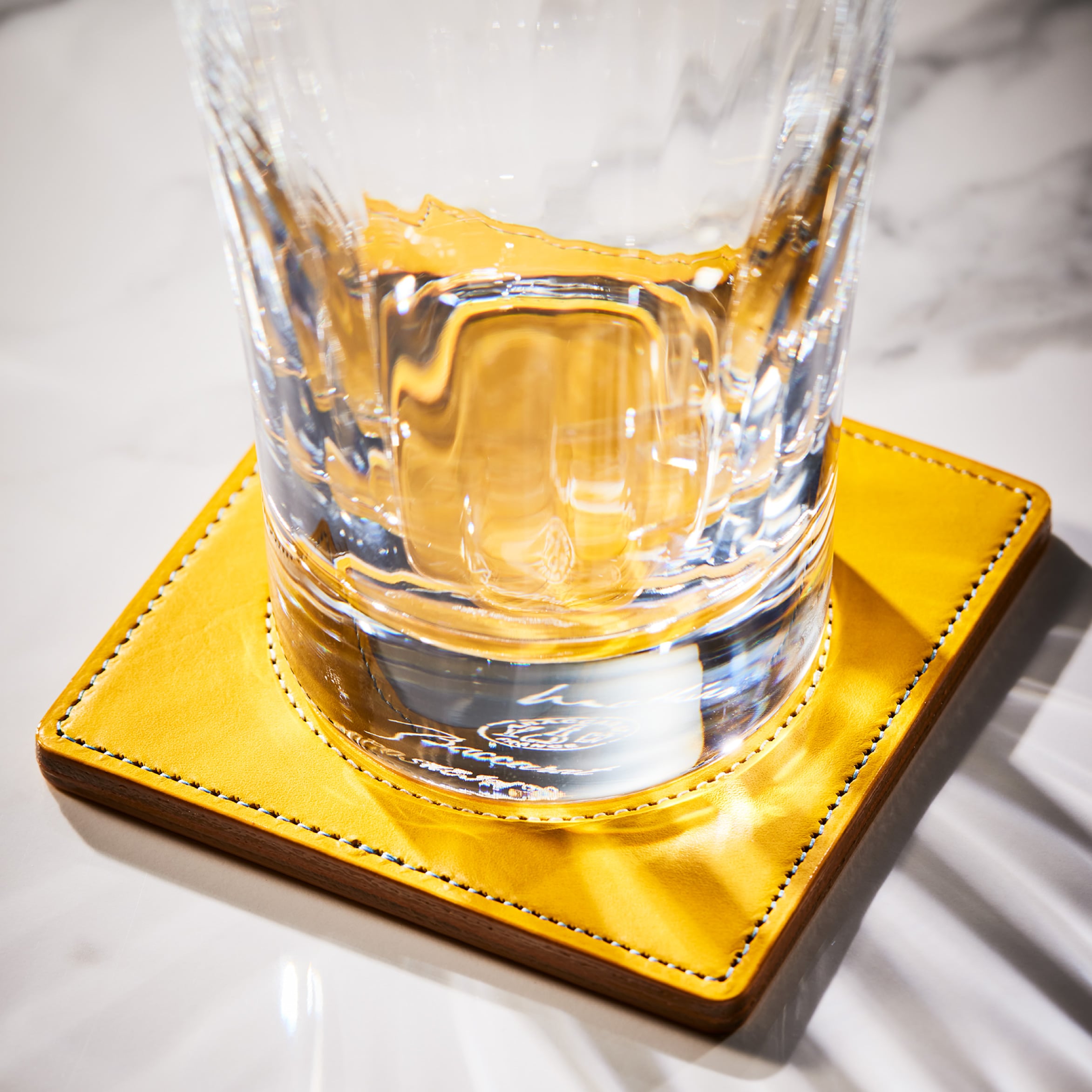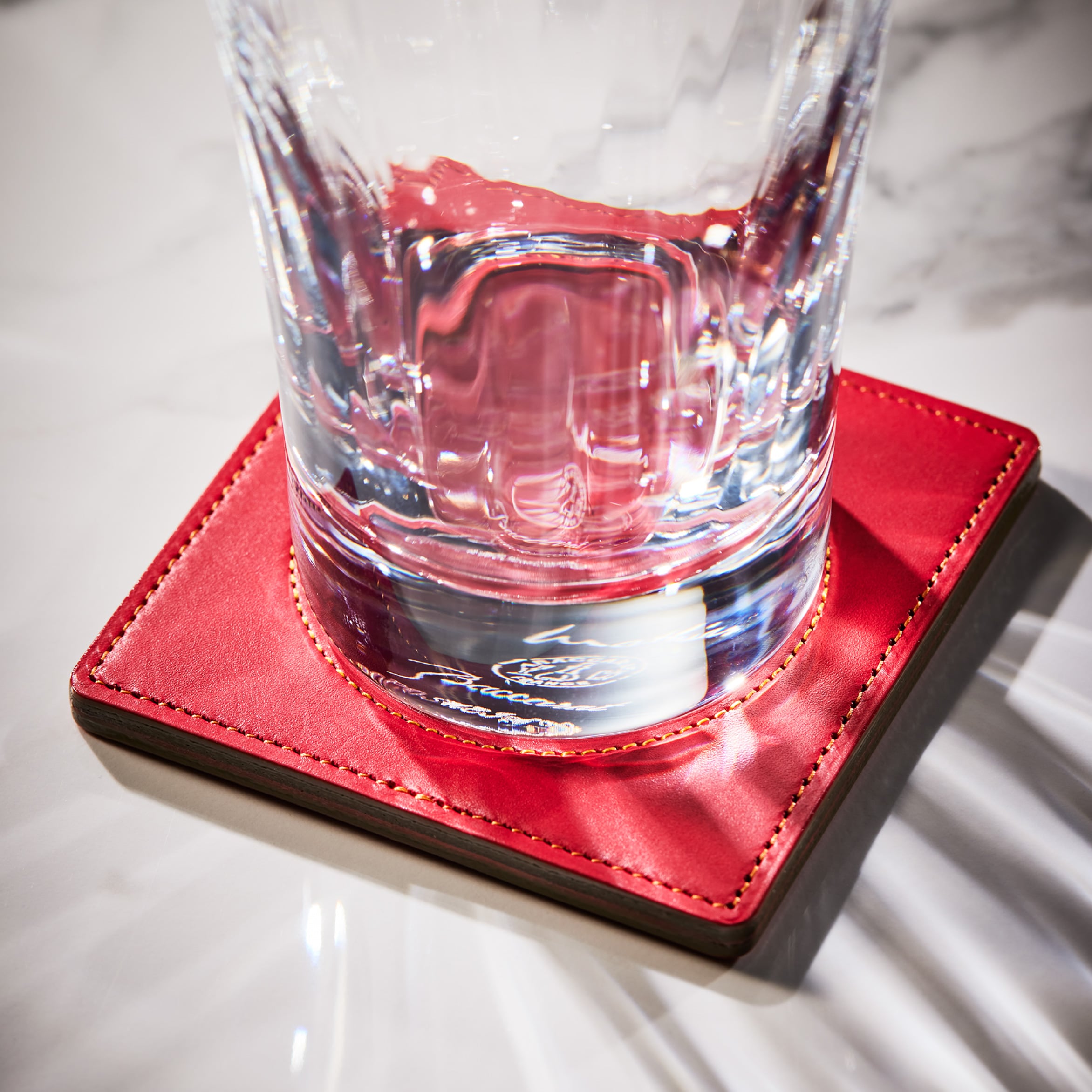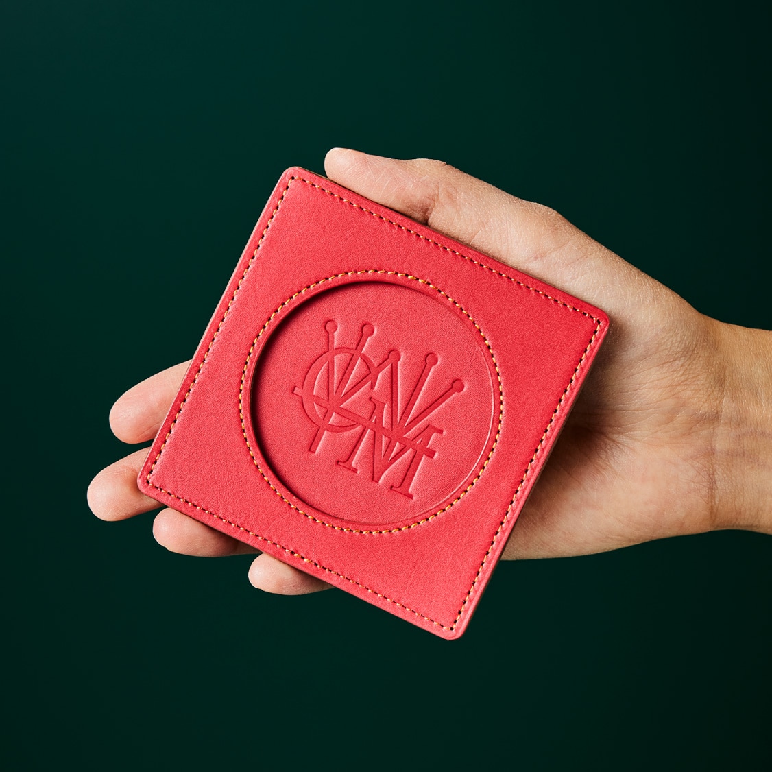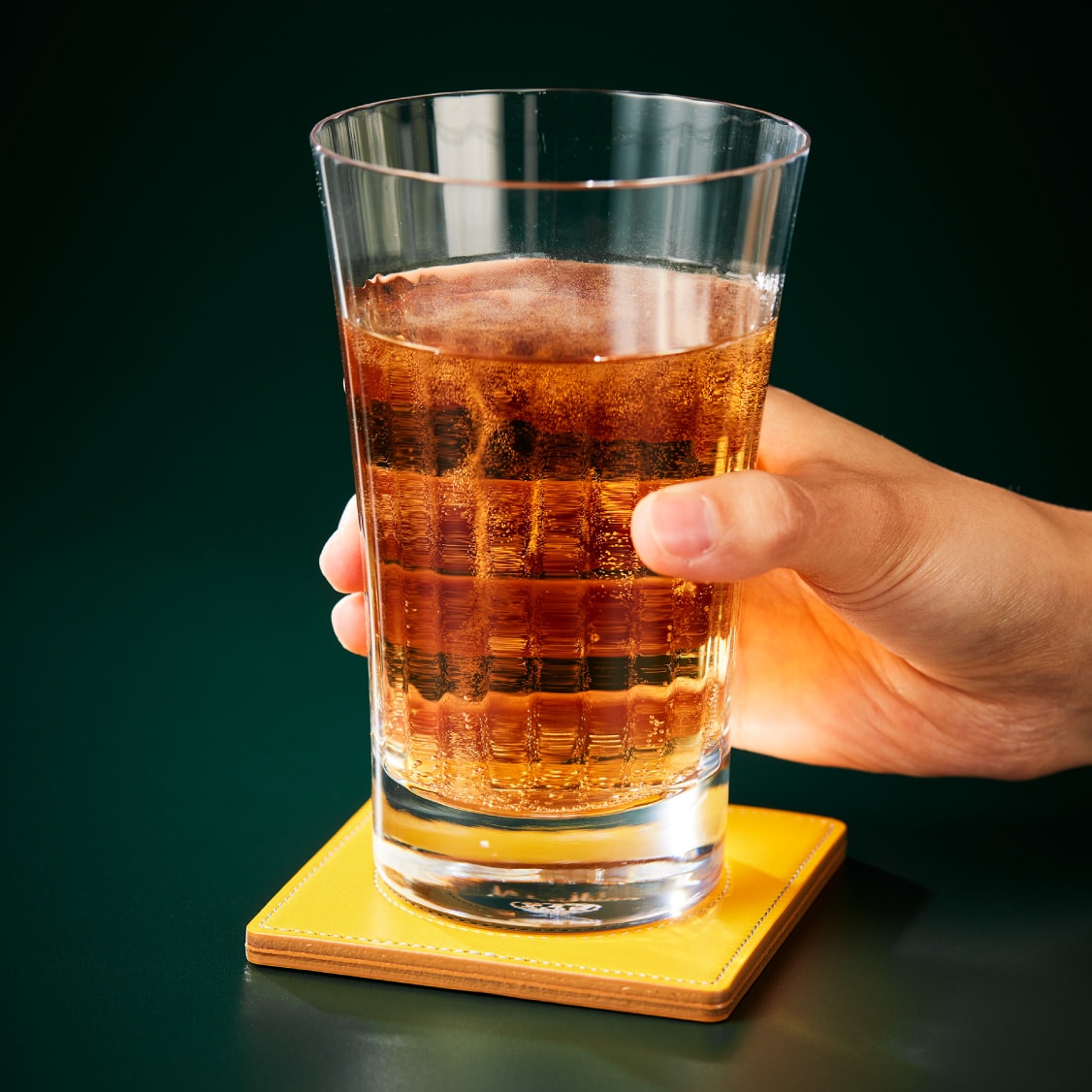 サンタクローチェレザーとオークバークレザーを重ね合わせた、独特の硬さと柔軟性を実現。円の外側に高さがあり、円の内側は高さが低くなっておりますので、グラスを置いた時の安定感があります。また、見た目にも安定感がありますので、グラスが倒れる心配がいりません。