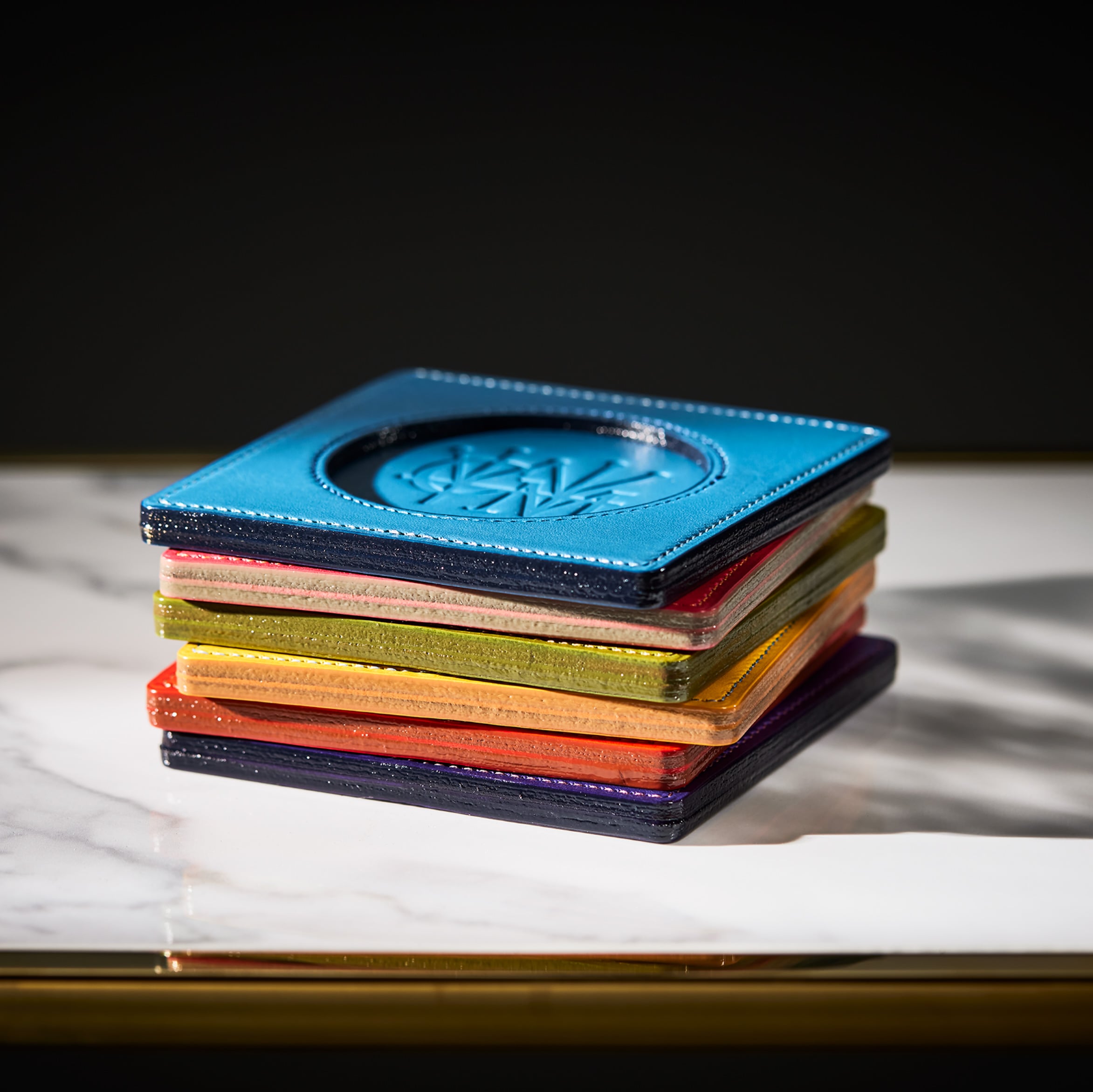 レースという戦いの世界から生まれたレーシングカラーズコレクションです。色鮮やかなイタリア産サンタクローチェレザーとオークバークを重ね合わせたお洒落なコースターです。革を重ねることで、色鮮やかで硬質な質感を実現しました。円の部分は直径6cmとなり、少し小ぶりでどんな場所でも使えます。
