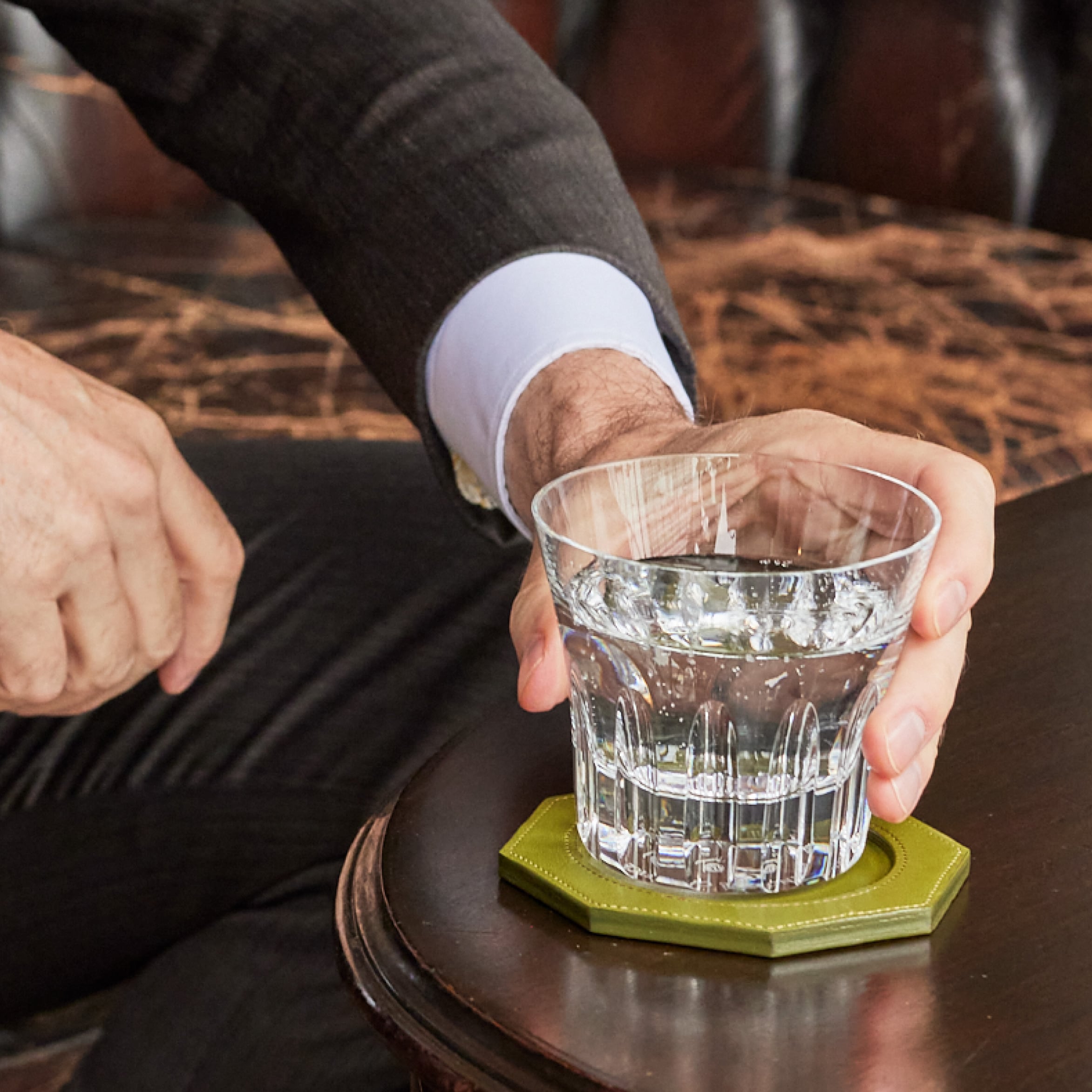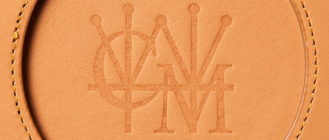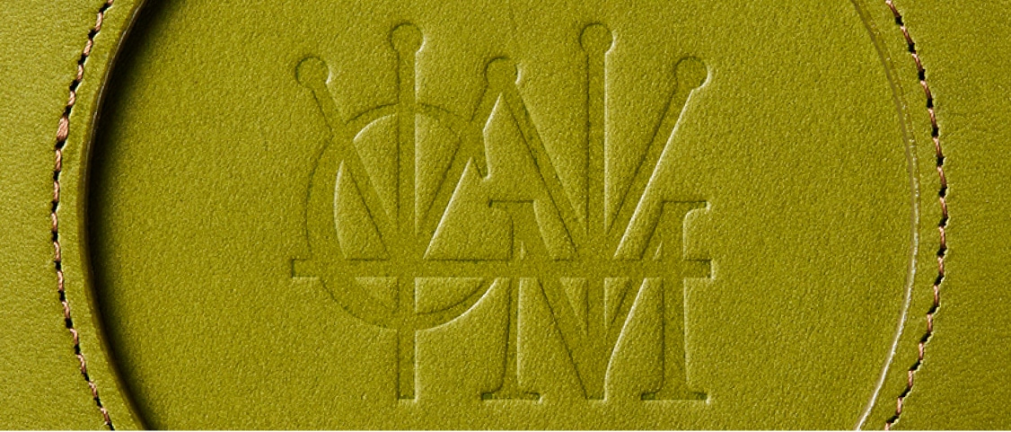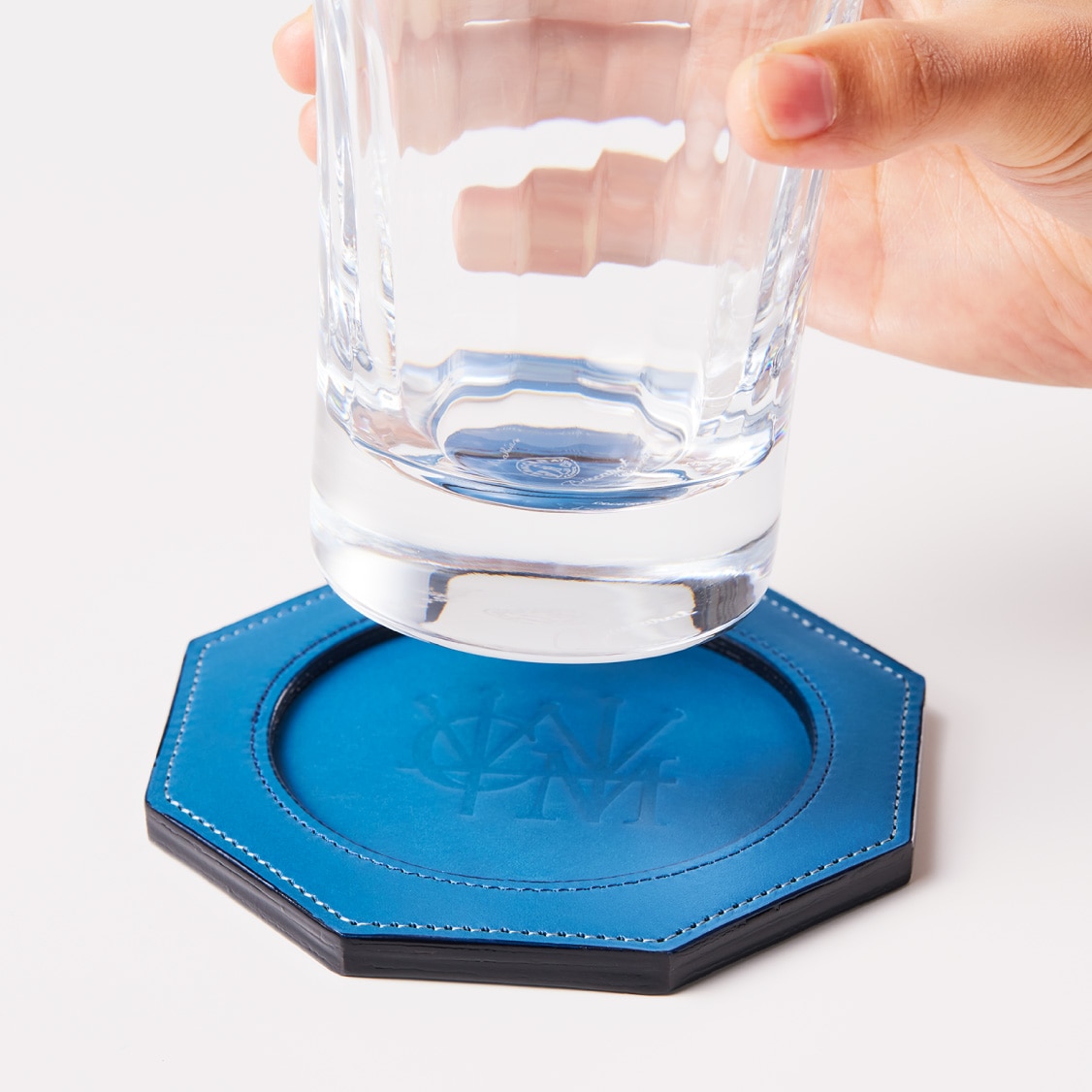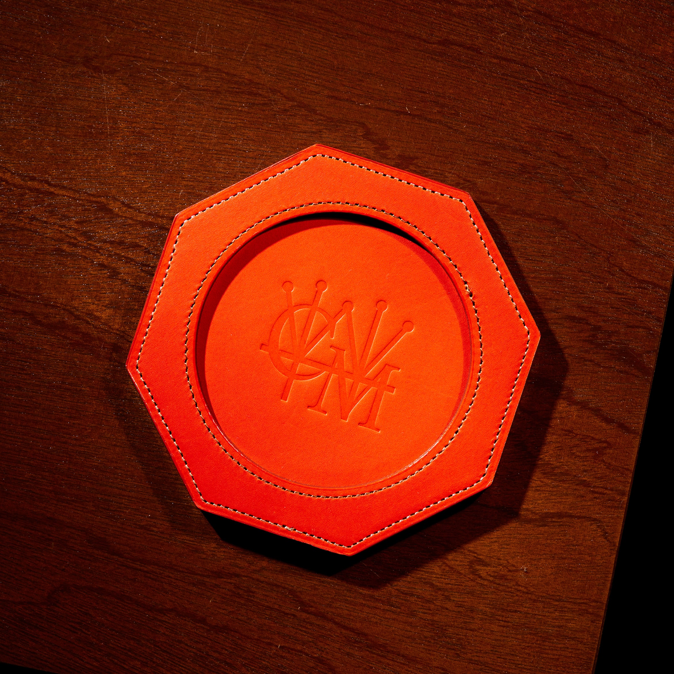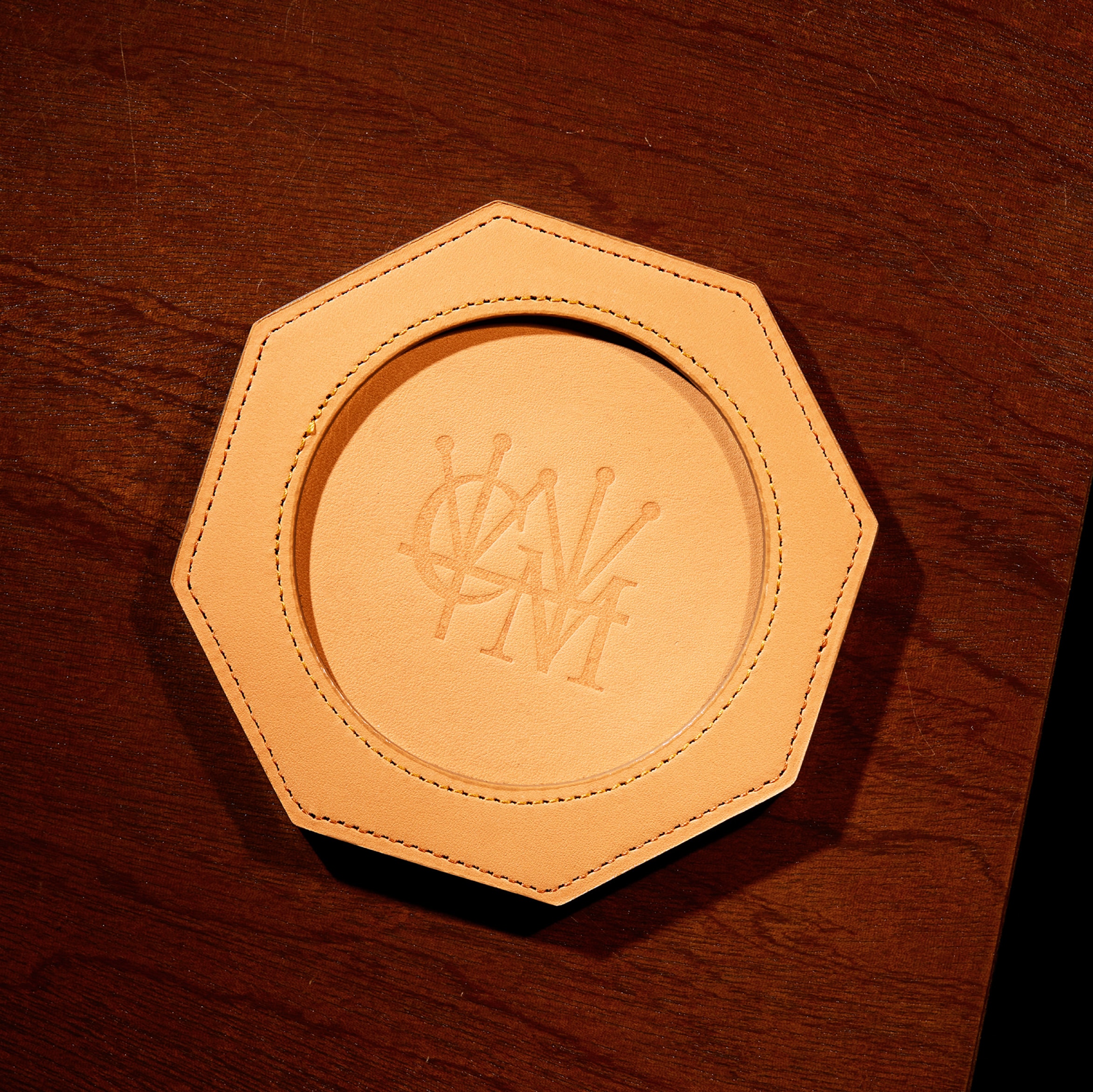 Detail 03シンプルにロゴを刻印しており、この上にグラスを置きます。グラス越しに模様がじんわりと見えますので、革の濃淡を楽しめます。