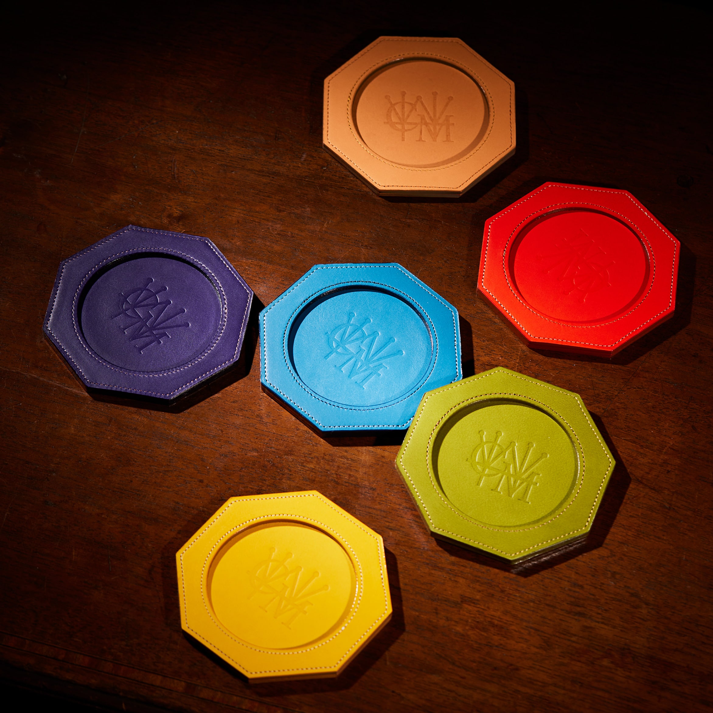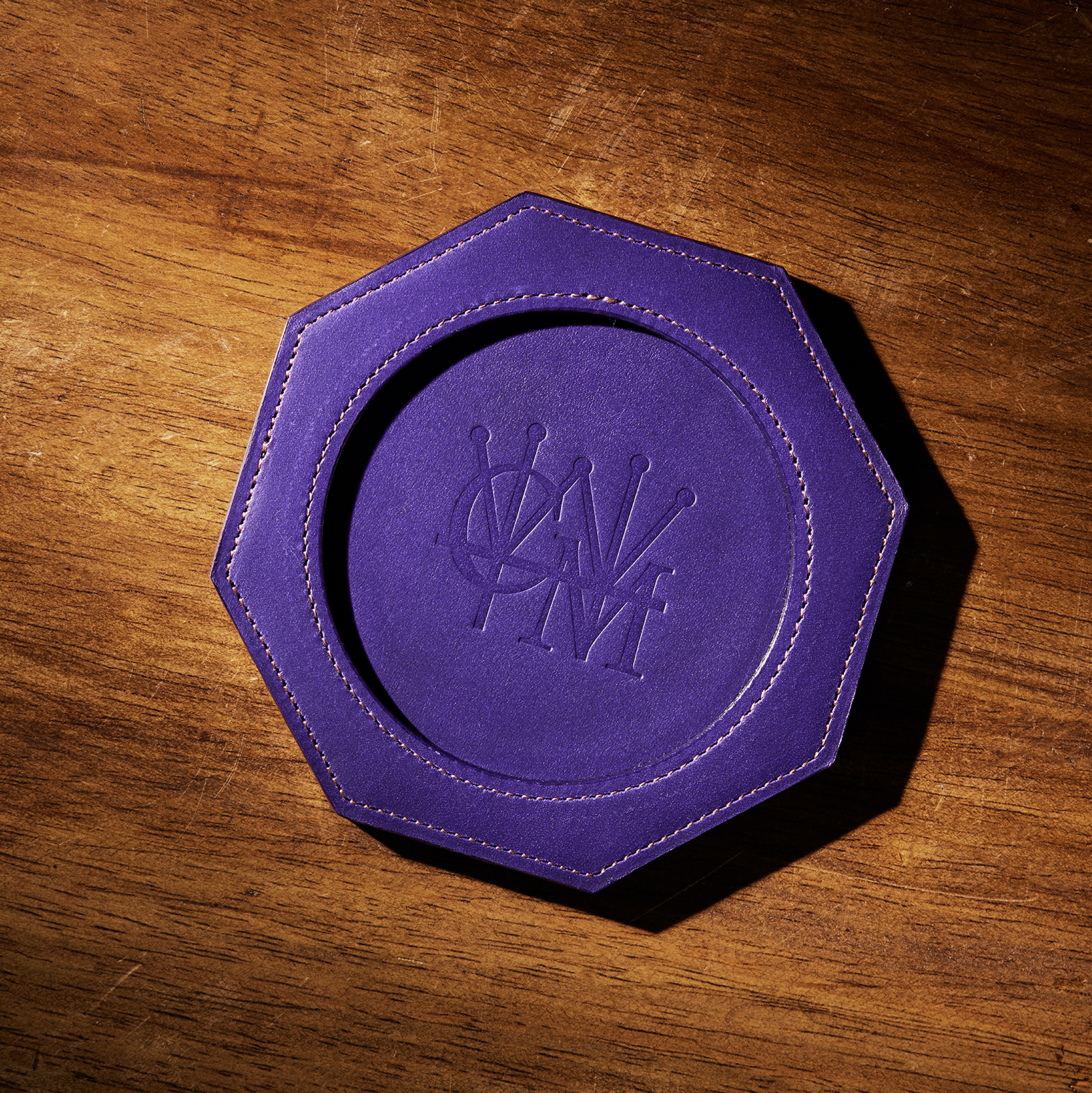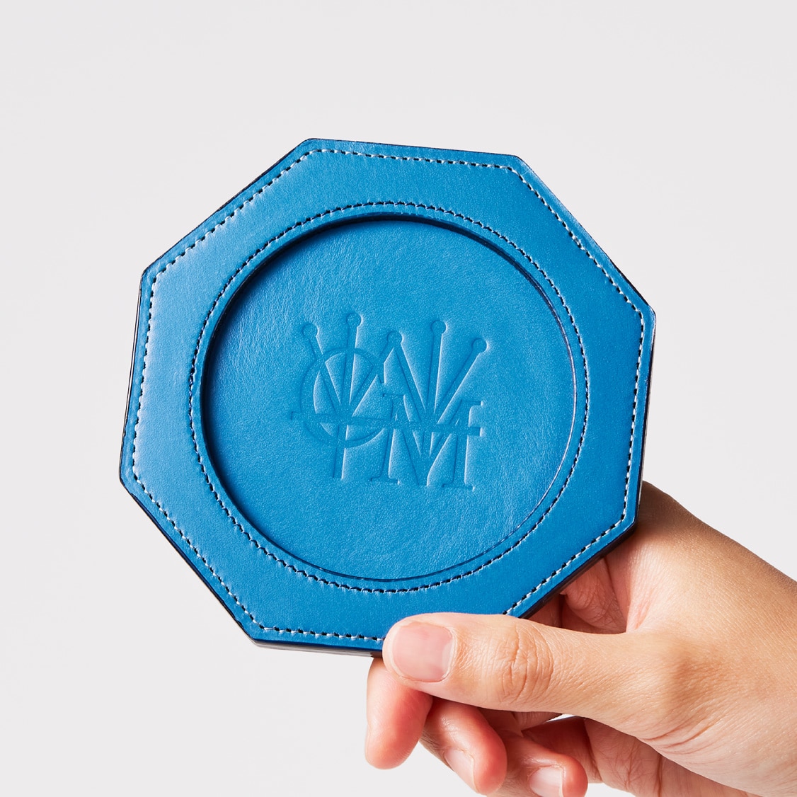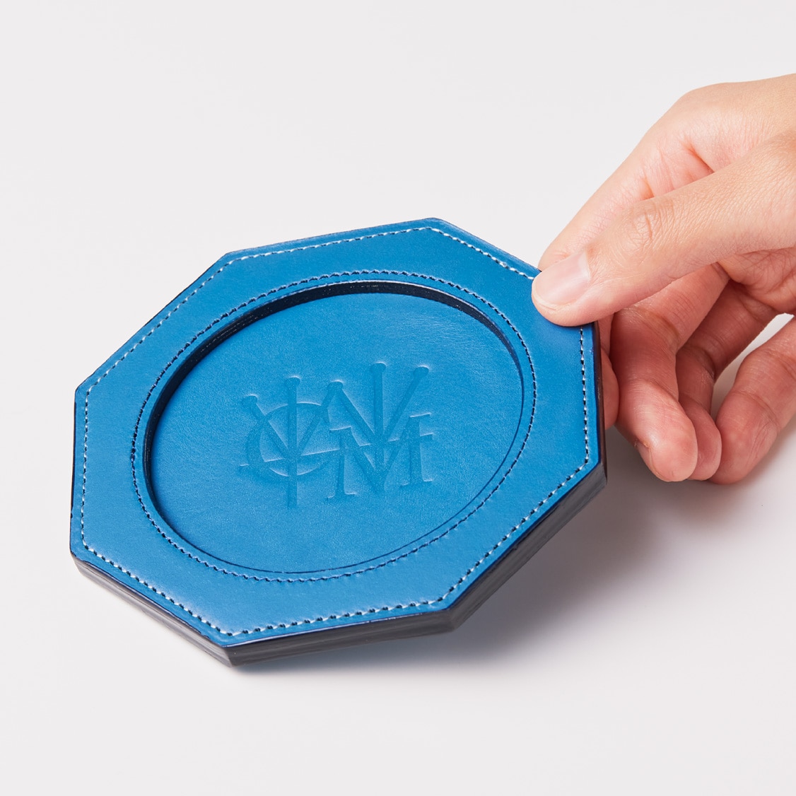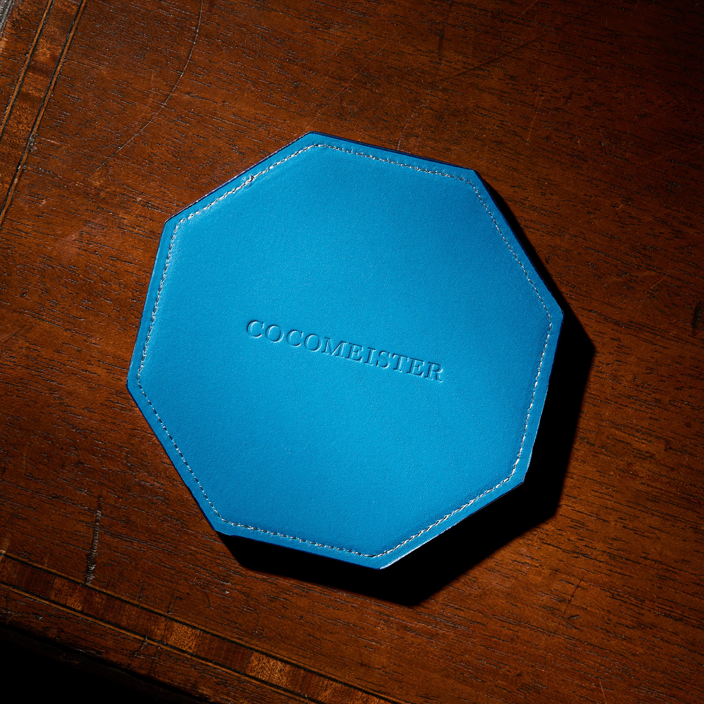 裏面にはシンプルにココマイスターのロゴを刻印しています。裏面にイタリアンレザー、内部にはオークバークレザーを使用し、この厚みと硬質さを実現しています。カラフルな色味のイタリアンレザーと、内部はオークバークで仕立てた、重厚感とイタリアンレザーの華やかさが魅力のペンタゴンコースターです。