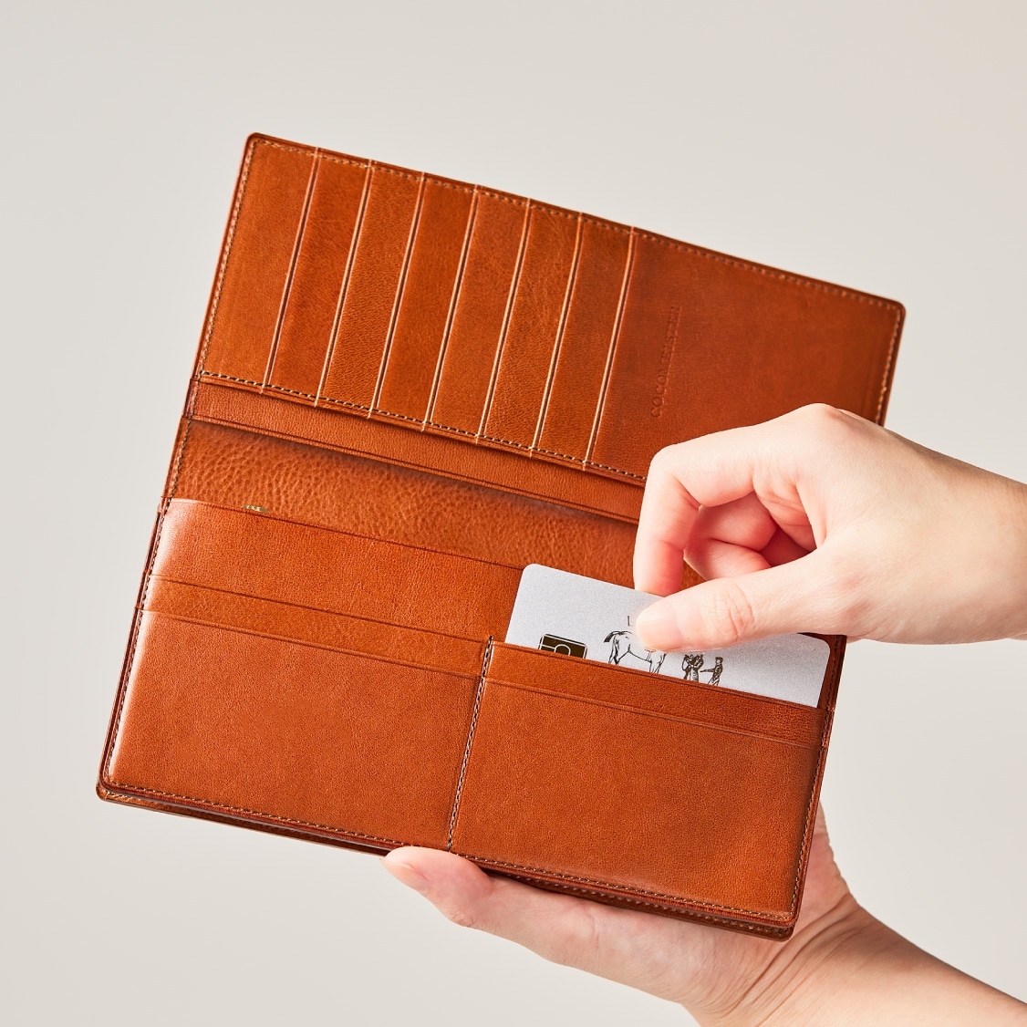 クラシカルな長財布で重厚感があり、伝統的な雰囲気を感じさせるのがこの通しマチ長財布です。職人技を感じさせる作りで、シンプルですがとても贅沢な作りをしています。財布を開くと、クレジットカード、お札と小銭にすぐにアクセスできるデザインになっていますので、スピーディなお会計、スマートさが特徴でもあります。