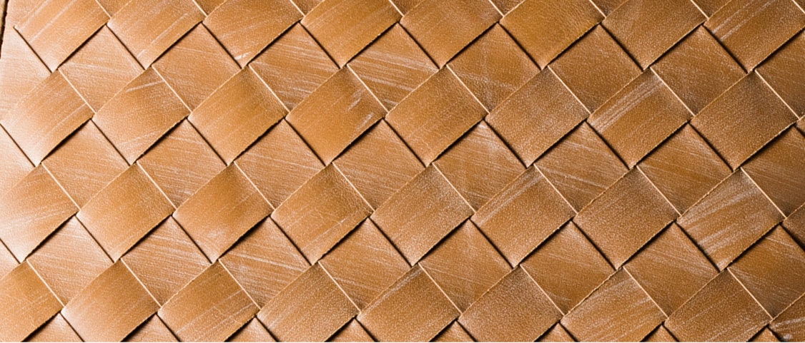 オークバークレザーをバリケードメッシュに極太編み込みを施し、力強く、高い堅牢性を誇る鉄壁の風合いに仕立てました。経年変化も濃淡が随所に美しく、グラデーションの様な表情を楽しめるのも、このイントレチャートの特徴です。