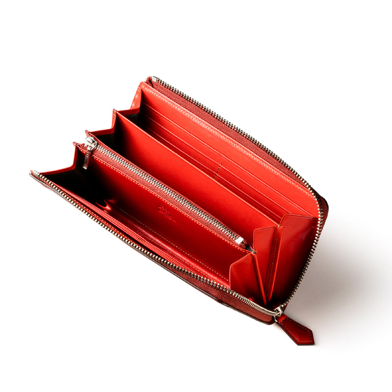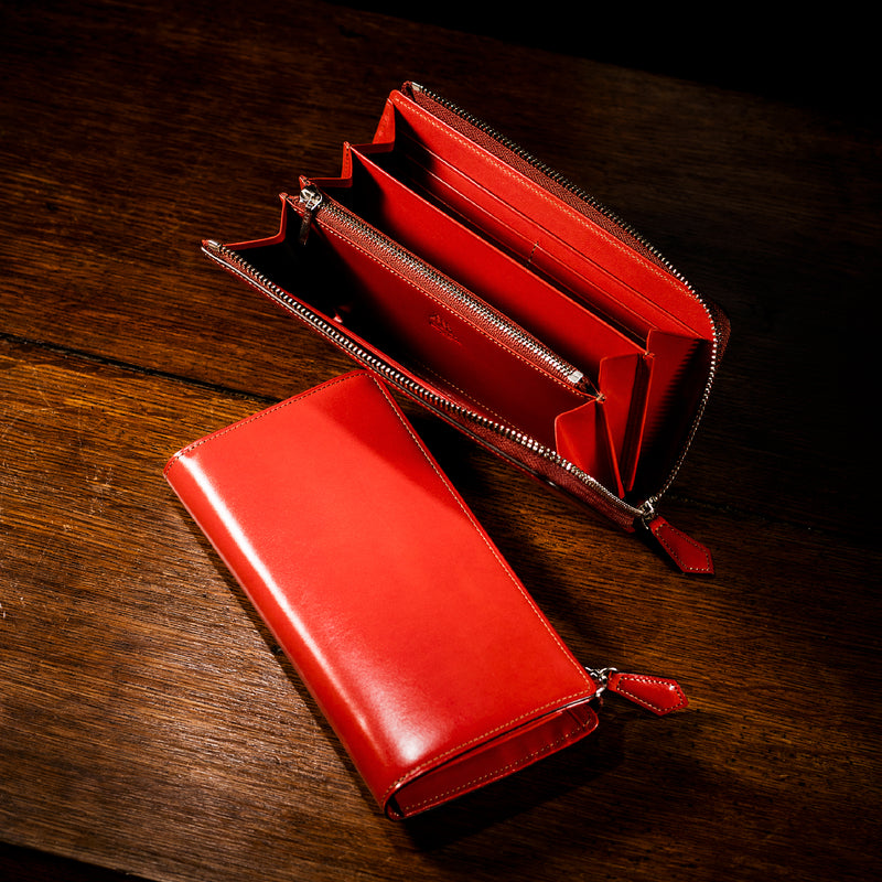 大航海時代をコンセプトにしたプルキャラックコレクションを、イタリア産最高級プルアップレザーを基本とし、高級家具用のレザー作りの技術を注ぎ込んだ「NEVADA」レザーで描きました。L字型のラウンドジップ長財布は、ファスナーの開け閉めがし易く、カードも取り出し易いのが魅力です。紳士物の職人が仕立てていますので、重厚感あるフォルムに仕上がっています。| 外寸 | 縦19.5cm×横9.6cm×厚み3.6cm |