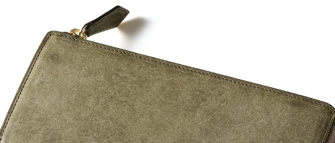 イタリア千年の歴史を持つ伝統製法により作られたバケッタレザーに、表面を毛羽立たせる加工を施す事で、和紙の様な風合いと、ややヴィンテージな風合いを楽しめるレザーに仕上げられています。表面は起毛しているにも関わらず、サラサラした質感でオールシーズン使えます。