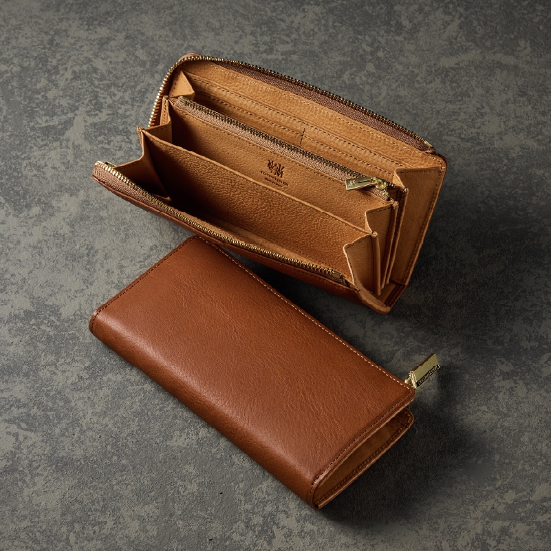 英国馬具革のブライドルレザーをプレスオンしたレザー。L字型ラウンドジップ。