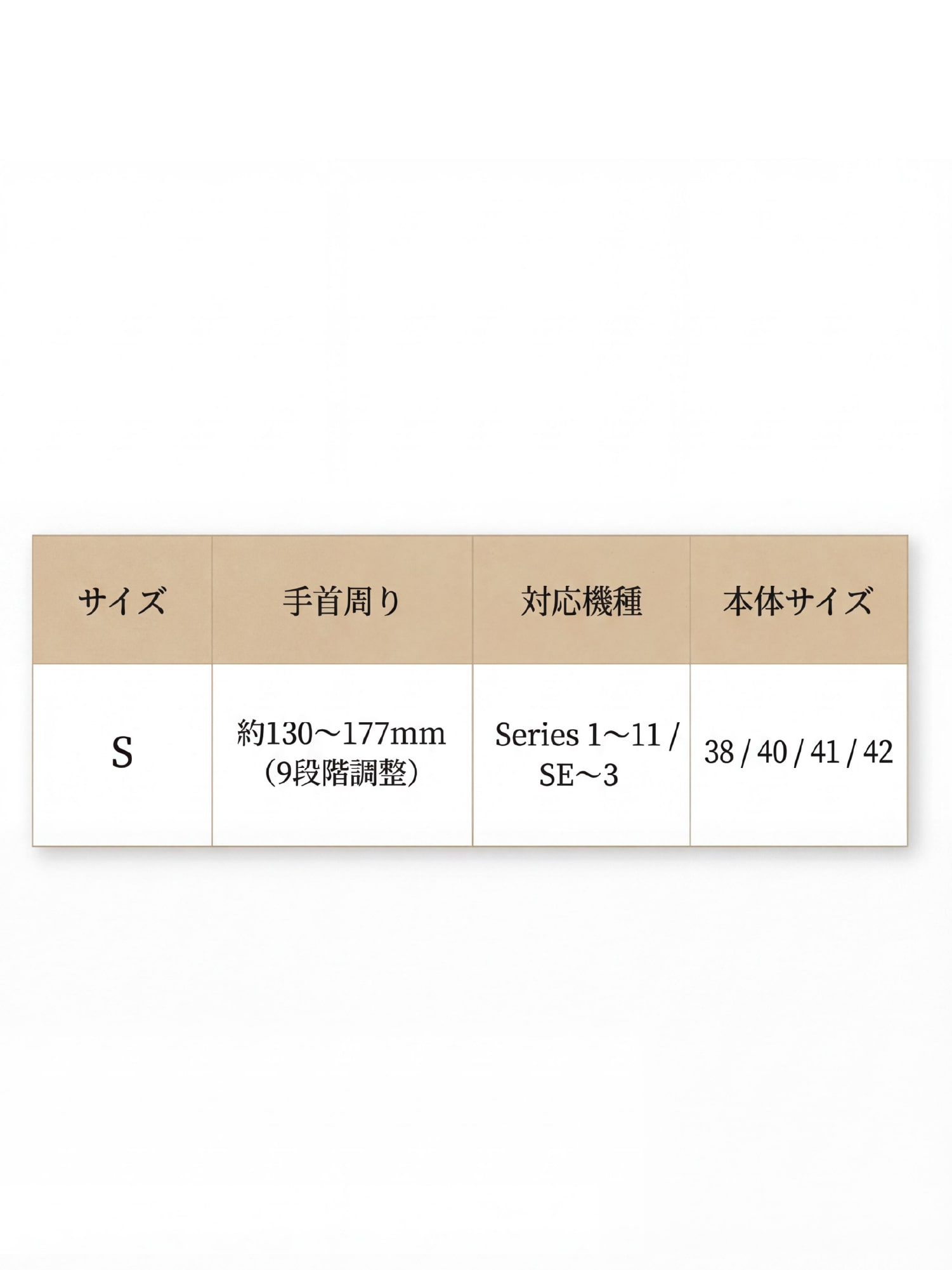 対応ケースは 38・40・41・42mm。普段使いしやすいコンパクトなケースに合わせやすく、手元をすっきり見せたい方にも自然に取り入れていただけます。