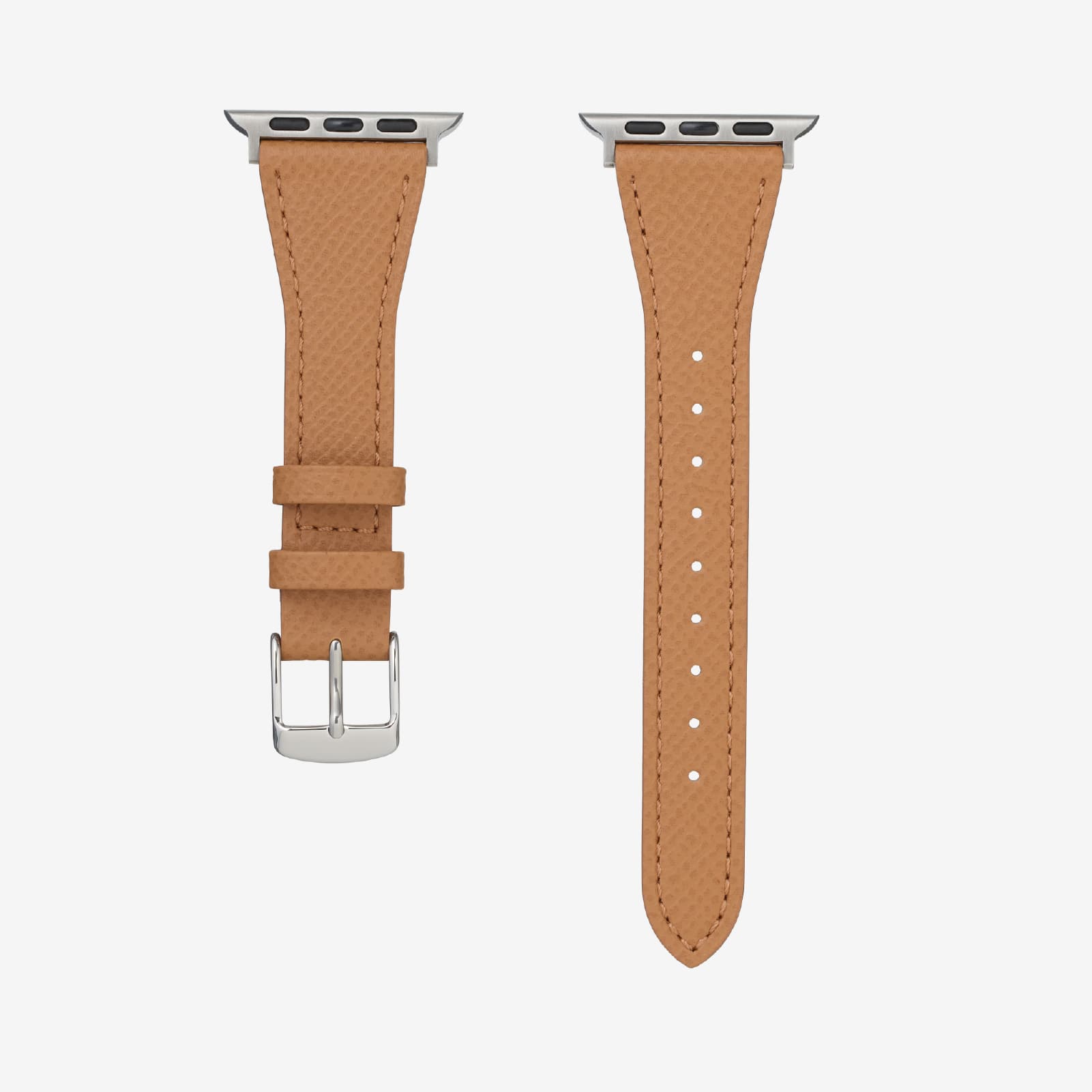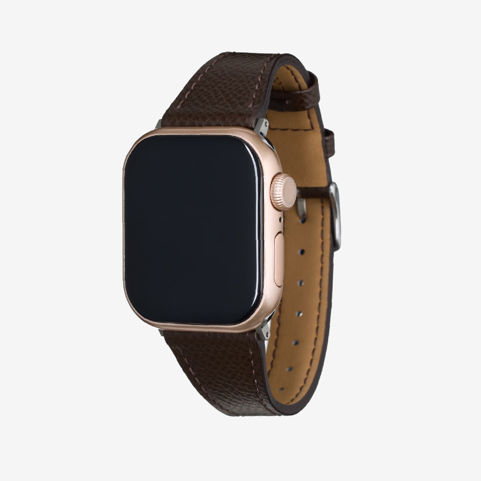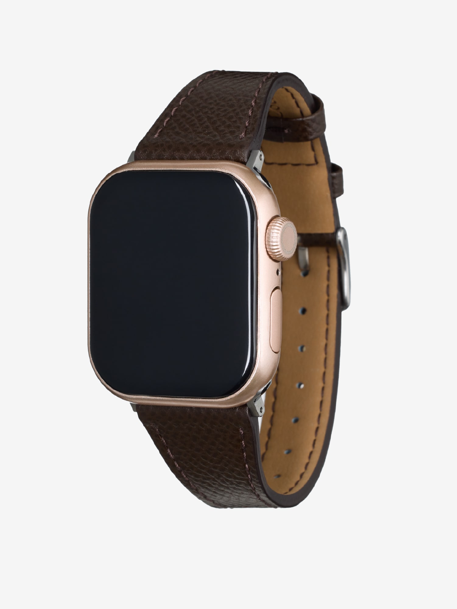 ノブレッサカーフの落ち着いた質感と控えめな艶が、手元にさりげない品を添えます。均一に整った型押しが美しく、シンプルなApple Watchにも自然に馴染む上質なバンドです。