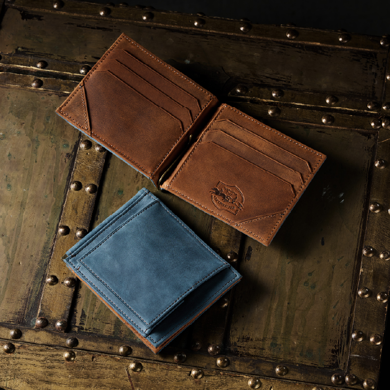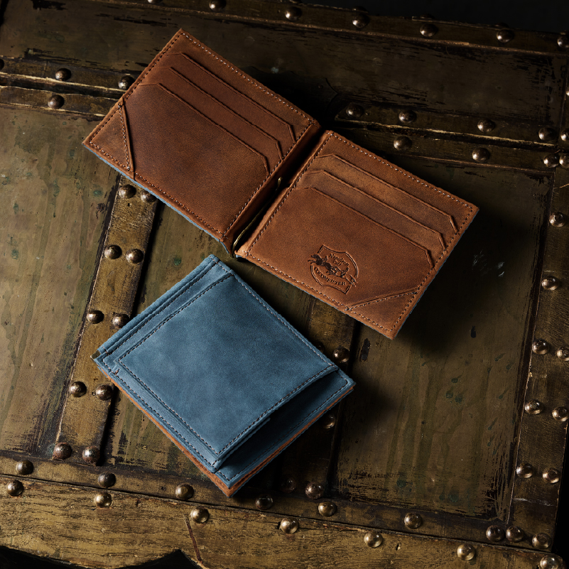 表面の起毛加工が特徴の最高級『プエブロ』レザーのエイジングを楽しむ、クラシカルな2つ折り財布。
