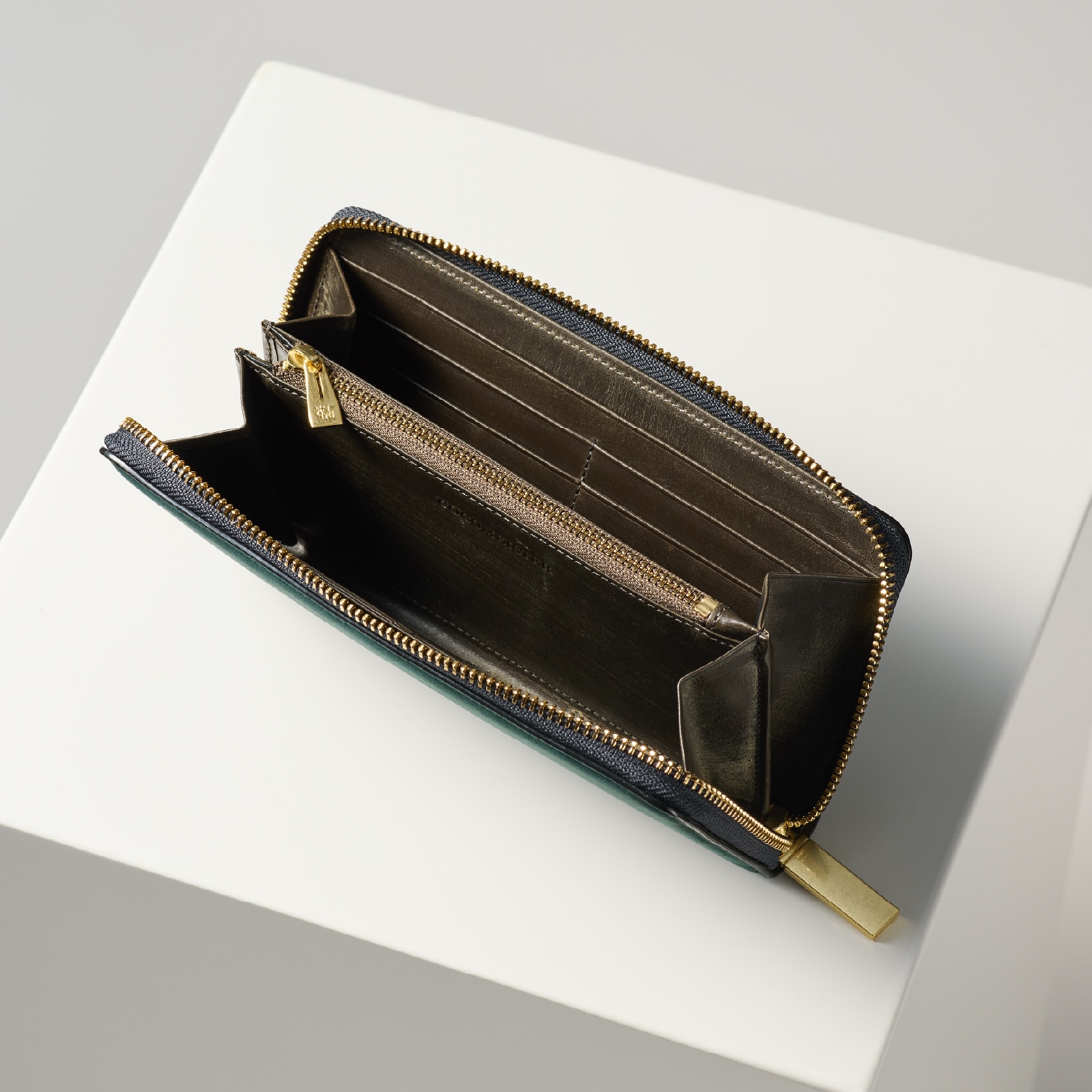 日本の水染めコードバンとイタリアンレザーのラウンドジップ長財布。