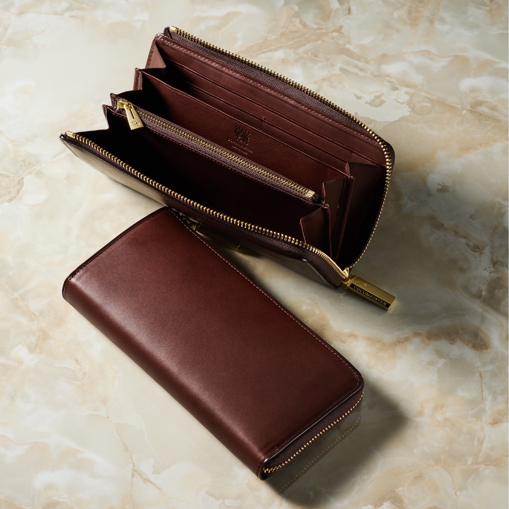 英国文化の真髄を追求したシリーズ、魅力ある感情的な手仕事で作り上げるラウンドジップ長財布。