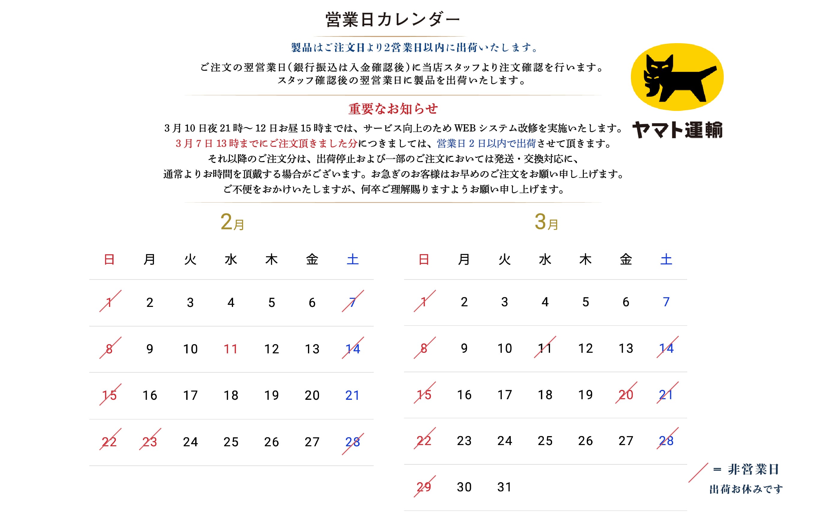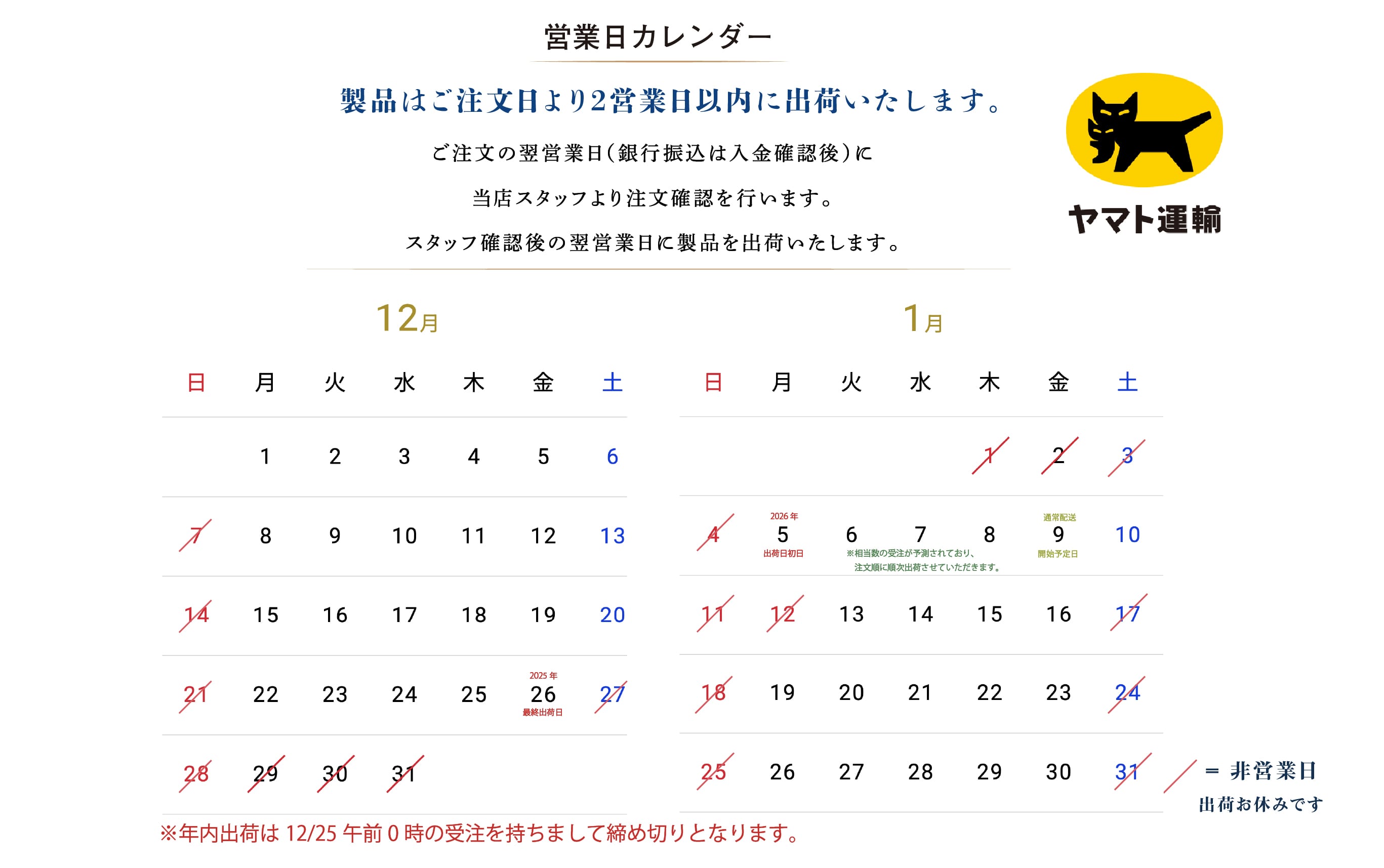 ※土日祝の稼働日はお手数ですが「出荷日・配送」欄の営業日カレンダーをご確認ください。