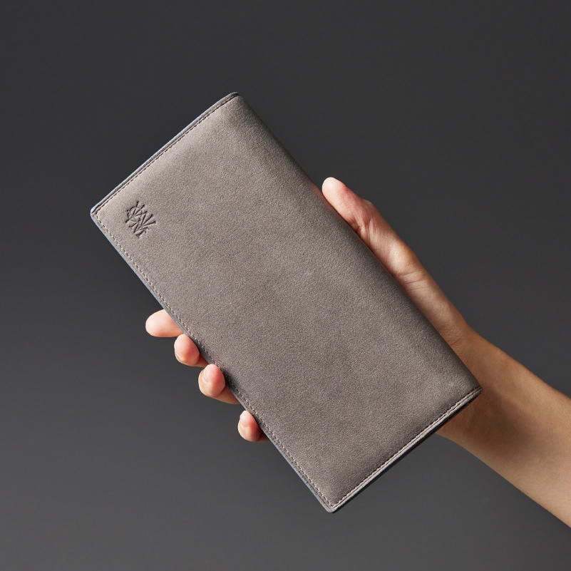 長財布そのものも新しい感覚だ。外が柔らかく、中がハードな質感の組み合わせ。スペインヌバックとオークバーク、どちらも質感にこだわり抜いた素材は、高級タオルとコルクを足した、不思議な質感を味わえる。
