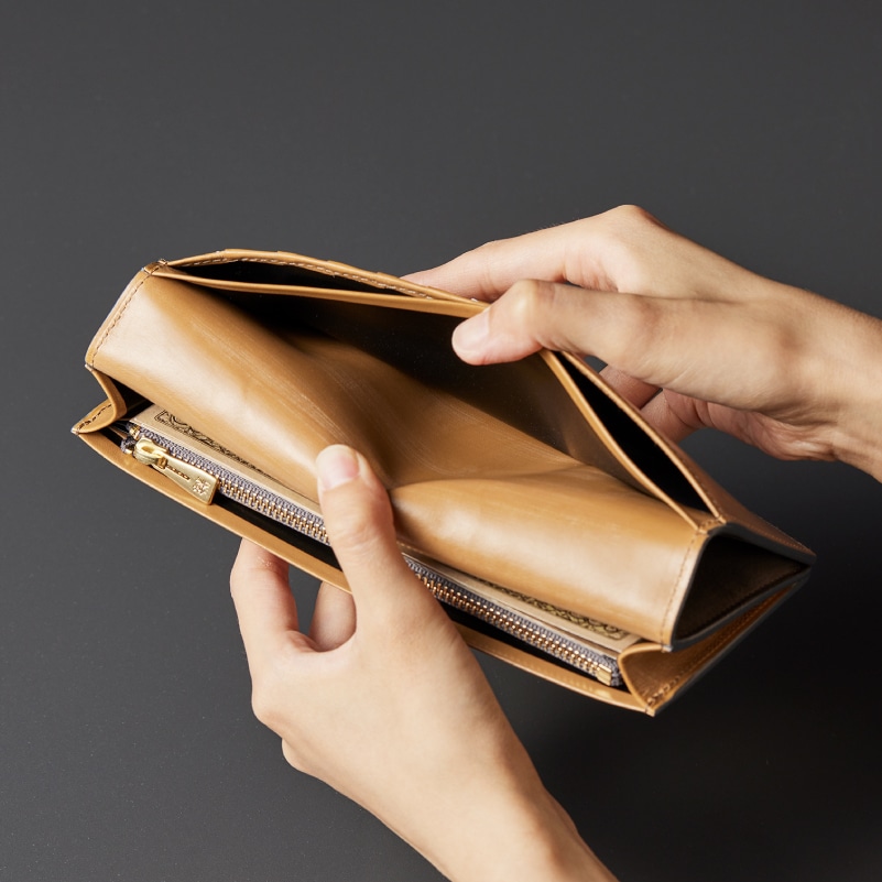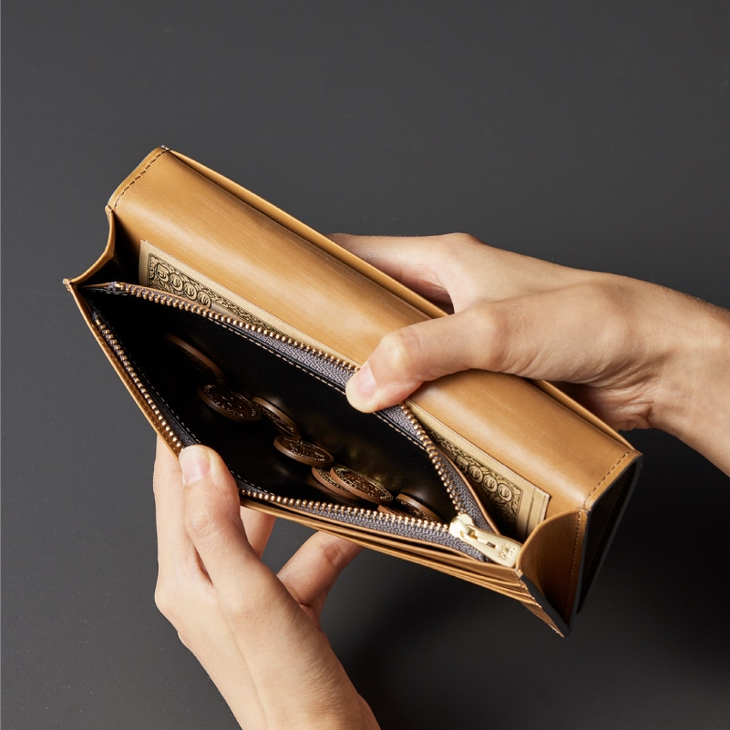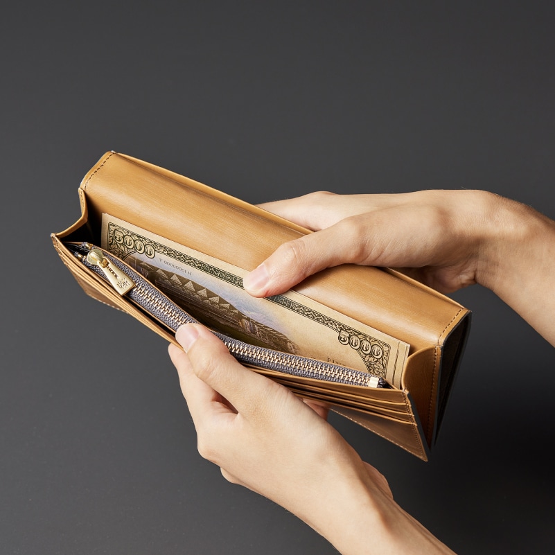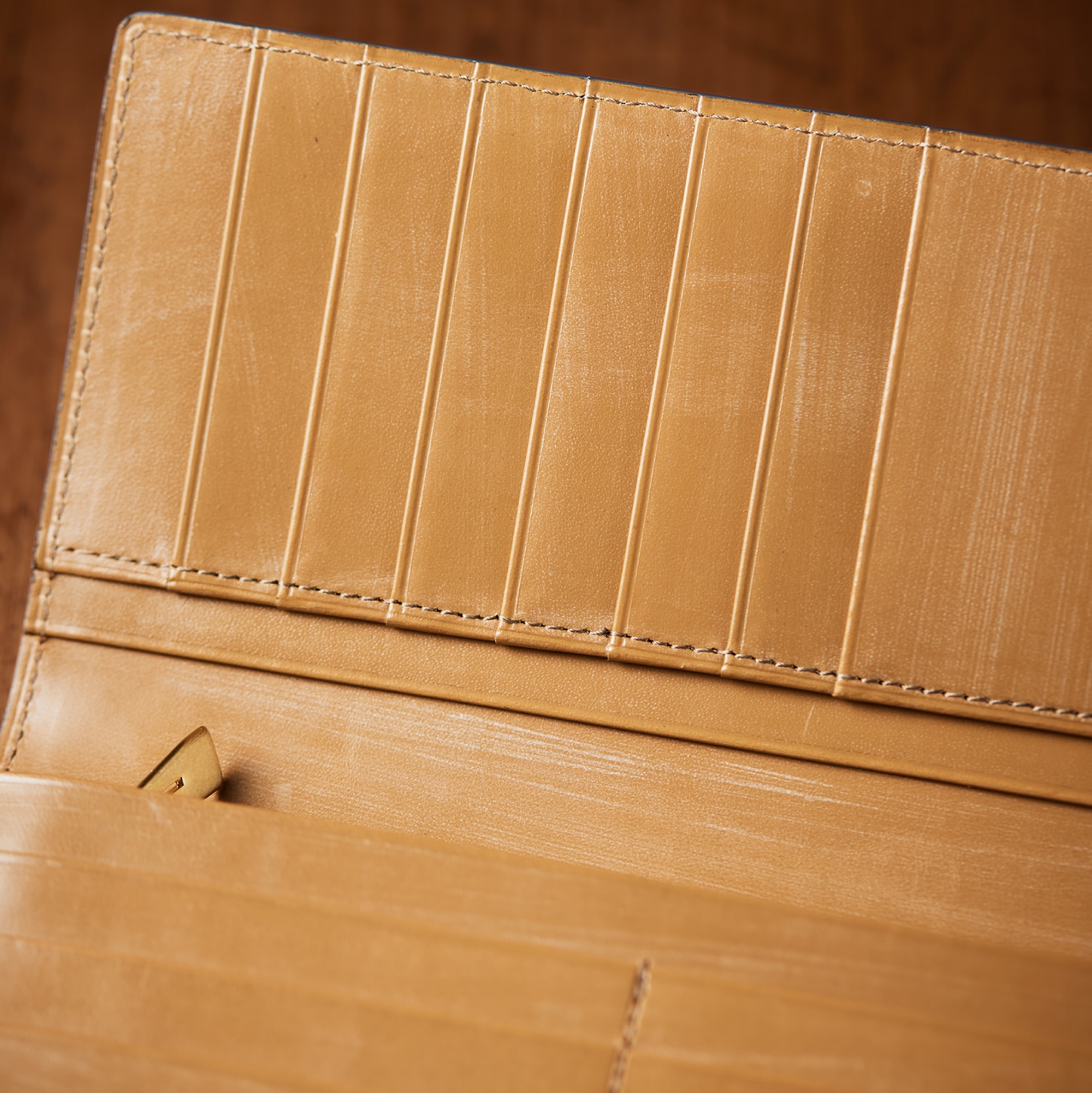 全面にオークバークレザーを使用しても、V字マチ長財布がスタイリッシュに見せてくれる。各パーツごとに、厚みを調整するこだわり。高い完成度で、クラシカルな仕上がりです。