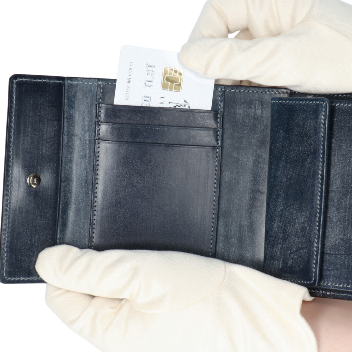 海賊からインスピレーションしたジョリーロジャーコレクション。海賊の人生観をイメージ、英国馬具革に圧倒的な圧力と熱量でプレスオンした皮革が、情熱と重厚さを醸し出しています。3つ折り財布は、折りたたむようなデザインが魅力です。基本機能を全て備え、ホックで止めますので中身を落とす心配がなくホールド感があります。
